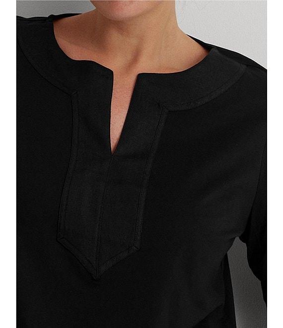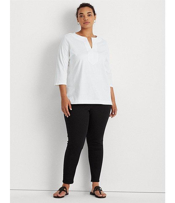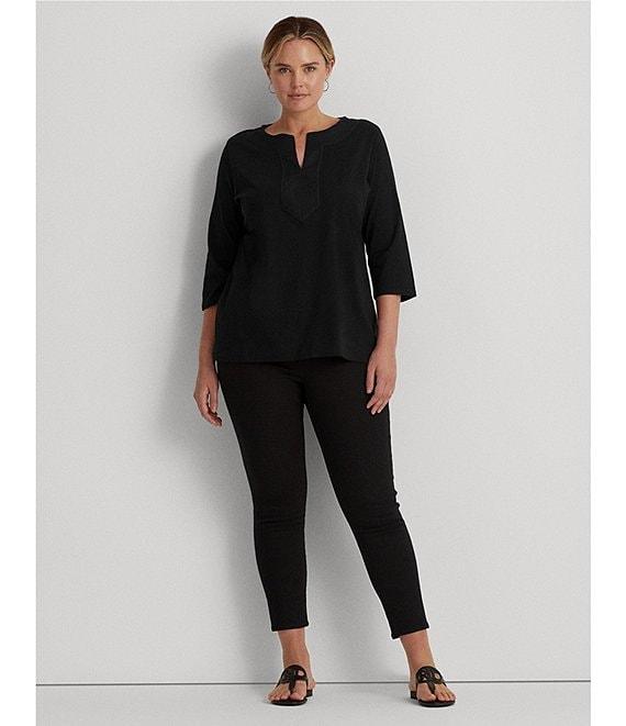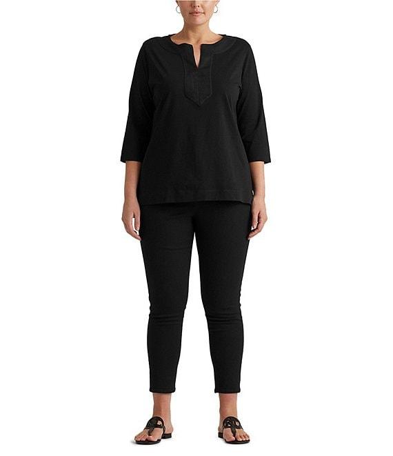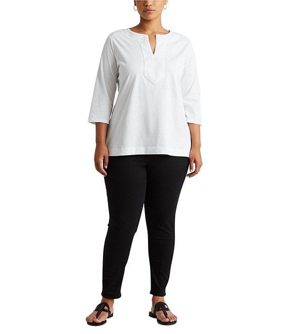 From Lauren Ralph Lauren Plus, this top features: knit jersey fabrication split round neckline 3/4 sleeves even vented hem pullover construction approx. 27.5" length cotton machine wash/tumble dry Imported. From Lauren Ralph Lauren Plus, this soft top is crafted from luxe combed cotton and will be a favorite in your wardrobe.