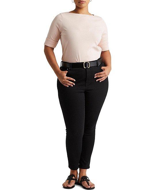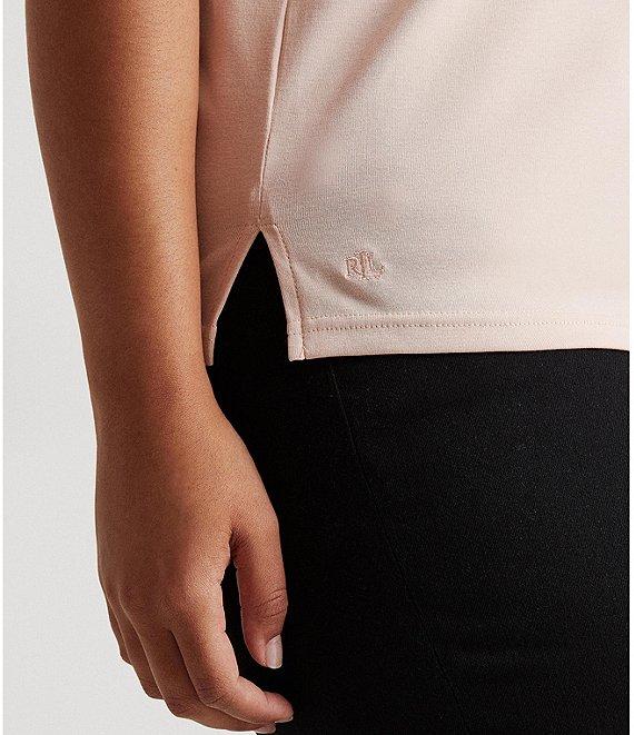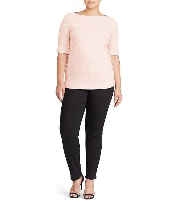 From Lauren Ralph Lauren Plus, this top features: boat neckline short folded elbow sleeves slim fit "LRL" embroidery monogram at the right waist Side split hemline Pullover construction Approx. 27" in length Cotton/elastane Machine wash Imported. This timeless wardrobe staple is crafted from a soft cotton blend and features a "LRL" monogram at the waist for signature Lauren style.