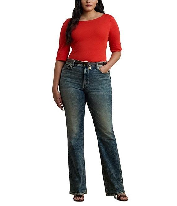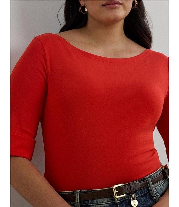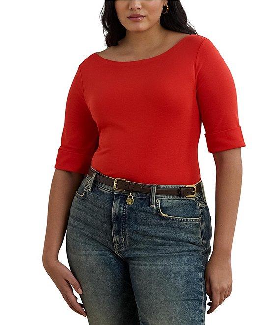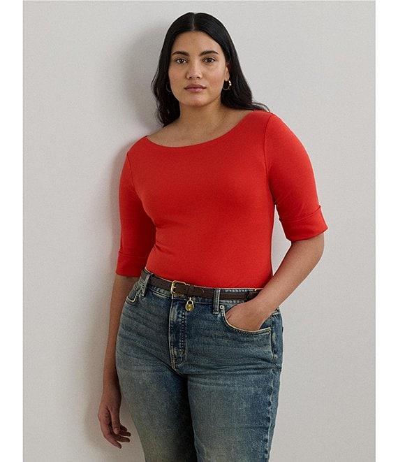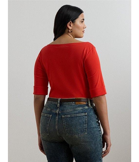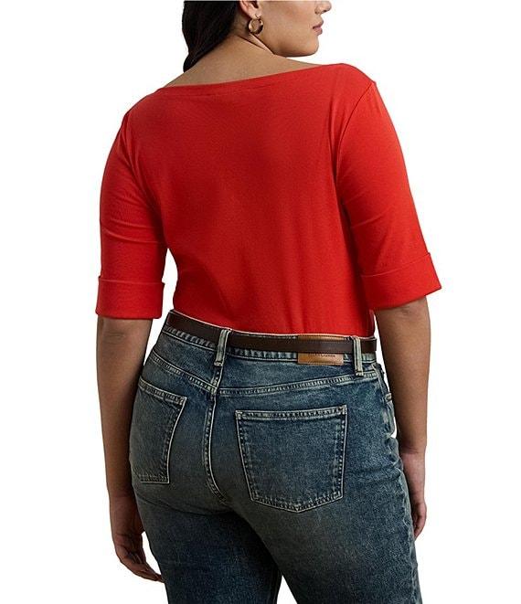 From Lauren Ralph Lauren Plus, this top features: Stretch cotton fabrication Boat neckline Elbow-length sleeves with ribbed cuffs Slim fit Intended to hit at the hip Signature "LRL" monogram embroidered at the front right hem Straight hem with side vents Pullover construction Approx. 27" body length, a 45½" bust, and a 31" shoulder Cotton/elastane Machine washable Imported.
