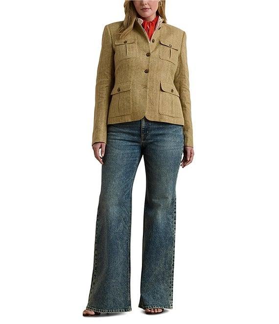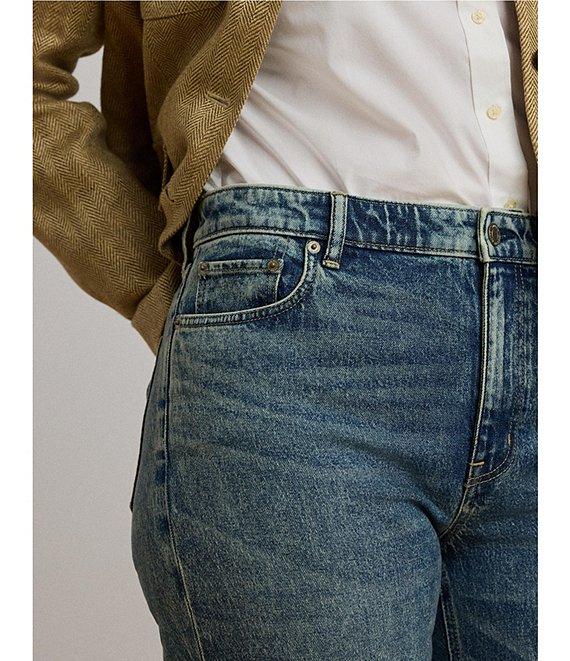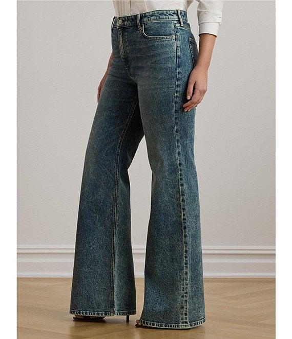 From Lauren Ralph Lauren Plus, these jeans feature: Stretch denim fabrication 5-pocket style High rise Flare leg Distress detail Relaxed fit Belt loops Button front/zip closure Approx. 32.5" inseam; 12.5" front rise; 27.5" leg opening Cotton/elastane Machine wash Imported.