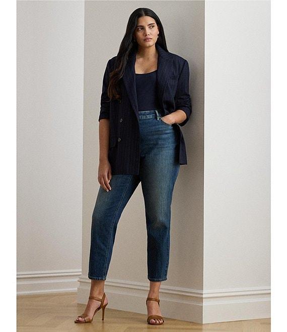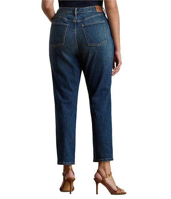 From Lauren Ralph Lauren Plus, these jeans feature: Twill denim fabrication High rise Relaxed fit Belt loops 5 pocket style Sits above the natural waist Slim through the hip and the thigh with a slim, straight leg Slimming interior panels lift and shape Debossed signature leather patch at the back right waist Ankle length Metal button and rivets custom-developed with a "Lauren Ralph Lauren" logo Front button and zipper closure Approx. 28" inseam, 17" leg opening, 12.5" rise Cotton/elastane; logo patch: leather Machine washable or dry clean Imported.
