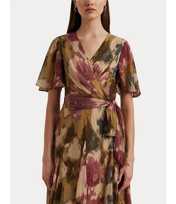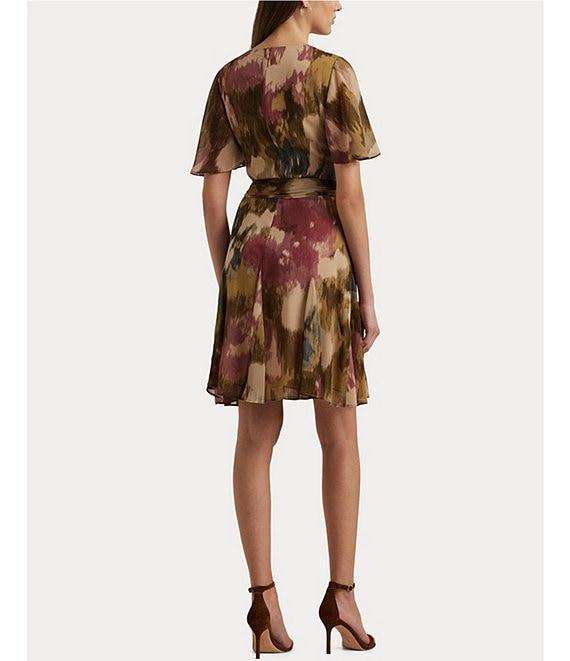 Lauren Ralph Lauren Printed Crinkle Georgette Surplice Neck Flutter Sleeve Pleated Self Belted Mini Dress