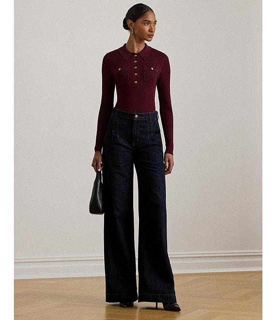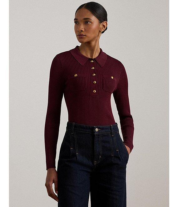 From Lauren Ralph Lauren, this polo sweater features: Ribbed knit fabrication Point collar Long sleeves Ribbed detail Two chest buttoned patch pockets Slim fit, intended to hit at the hip Ribbed hemline Button front closure Approx.22.5" length, 23.75" sleeve length , 05" between sizes Viscose/nylon Hand wash cold/flat dry or dry clean Imported.