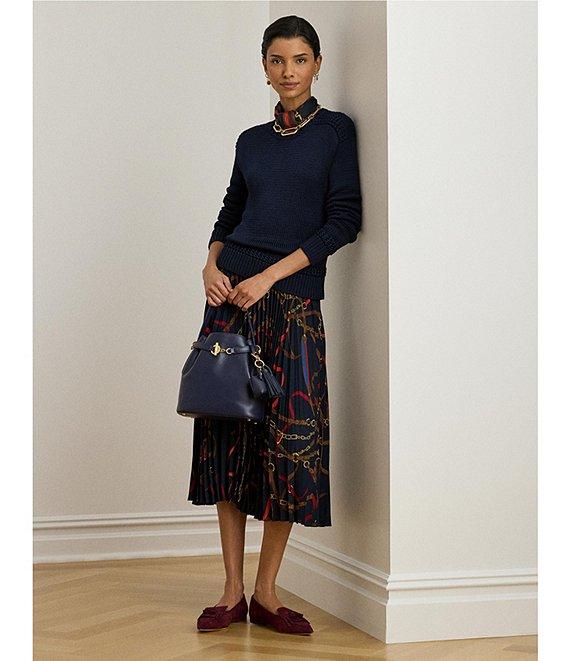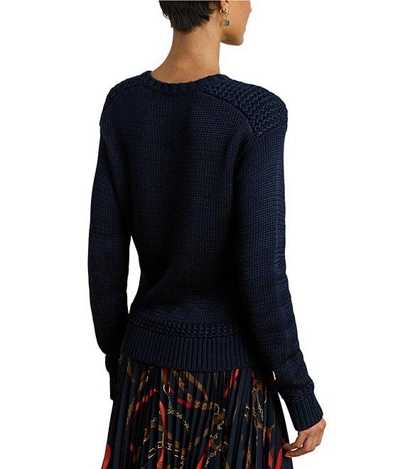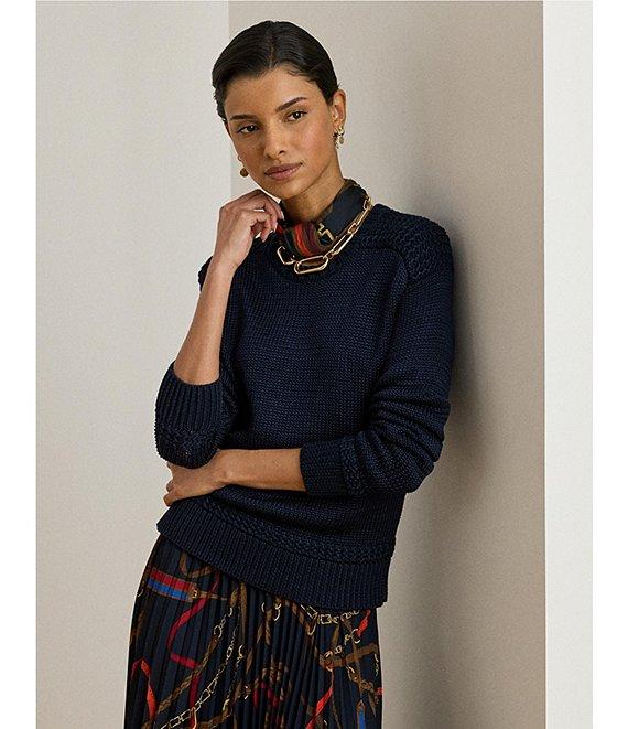 From Lauren Ralph Lauren, this sweater features: Ribbed knit fabrication Round neckline Long sleeves Ribbed details Relaxed fit Ribbed hemline Pullover construction Approx. 20" length, 21.25" sleeve length, 0.5" between sizes Cotton/viscose Machine wash cold/tumble dry low Imported.