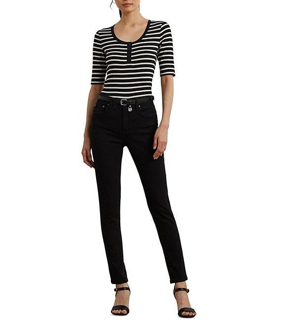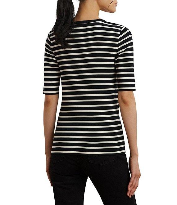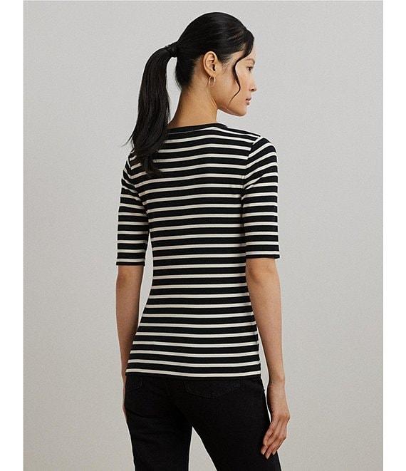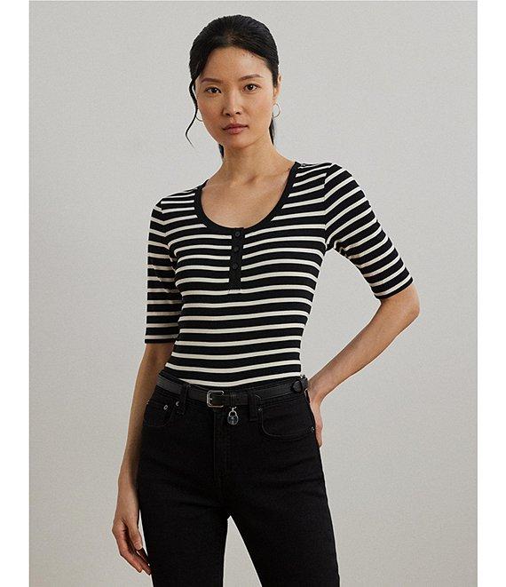 From Lauren Ralph Lauren, this top features: Ribbed knit fabrication Henley silhouette Horizontal stripe pattern Scoop neckline Elbow length sleeves Slim fit, intended to hit at the rip Embroidered LRL logo at the front right waist Shirttail hemline Three button closure Approx. 24" length, 11" sleeve length, 0.25" between sizes Cotton/elastane Machine wash Imported.