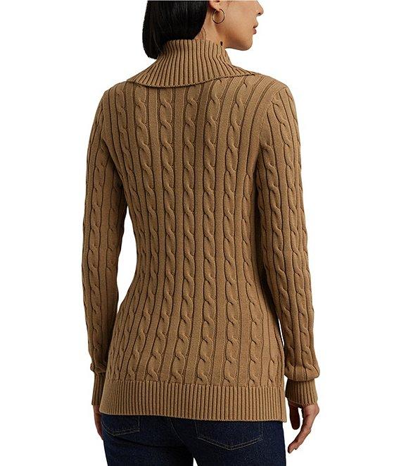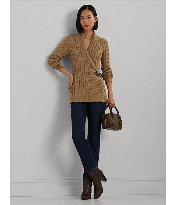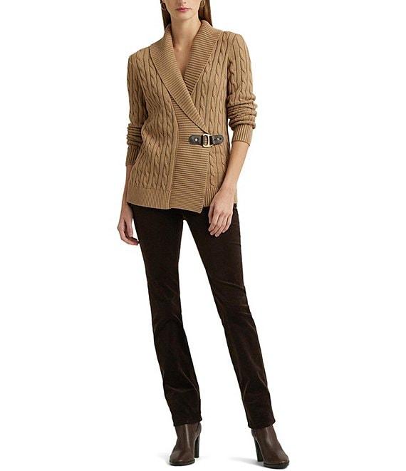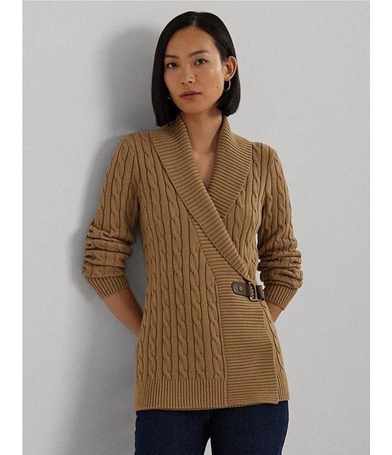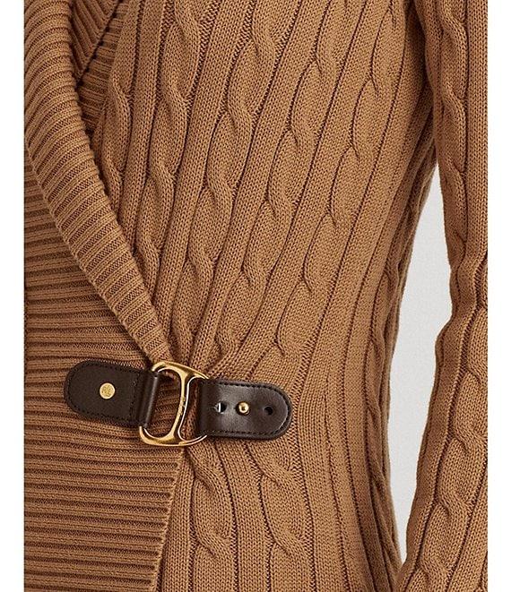 From Lauren Ralph Lauren, this sweater features: Pullover silhouette Ribbed shawl collar neckline Long sleeves with ribbed cuffs Relaxed fit Ribbed hemline Intended to hit at the hip Open front with buckle closure; "LRL" signature monogram engraved buckle Size medium has a 25.5" body length and a 24" sleeve length; body length is taken from the high point of the shoulder; sleeve length changes 0.5" between sizes cotton Machine wash/tumble dry Imported.