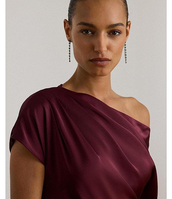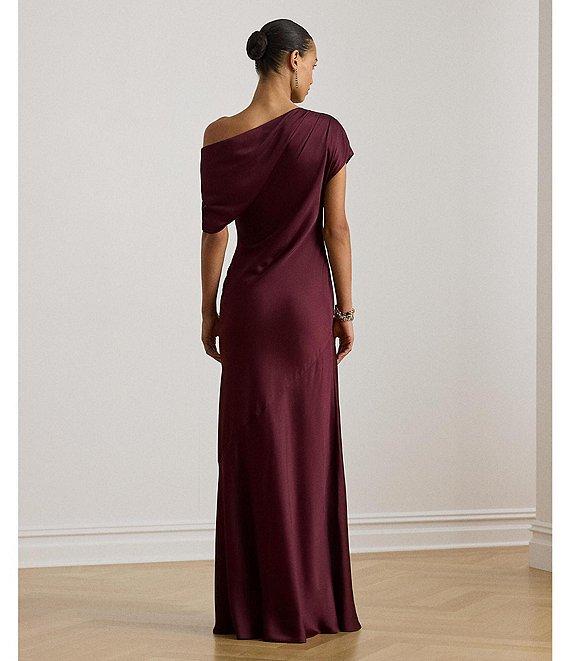 From Lauren Ralph Lauren, this dress features: Satin charmeuse fabrication Asymmetrical neckline Off the shoulder Sleeveless Lined Slim fit with subtle flare Pleat gathers at shoulder Pull on construction Approx. 61.75" in length Polyester Hand wash Imported.