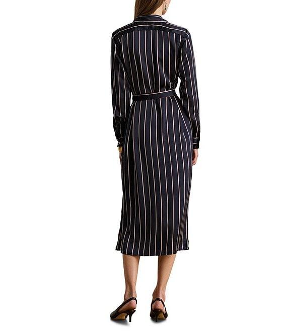 From Lauren Ralph Lauren, this dress features: Satin charmeuse fabrication Point collar Long sleeves with buttoned barrel cuffs Striped Straight fit Comes with a self-belt Threaded belt loops Unlined Bust darts Back yoke Side-split hem Button front closure Approx. 48.5" length, 32.25" sleeve length Dress length and sleeve length are taken from the center back of the neck. Dress length changes 0.75" between sizes. Sleeve length changes 0.5" Polyester Hand wash or dry clean Imported.