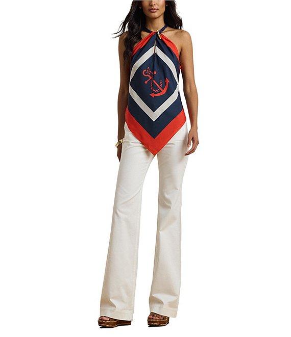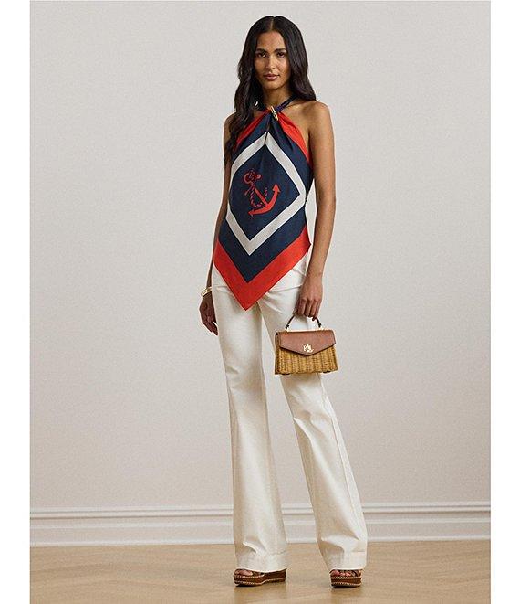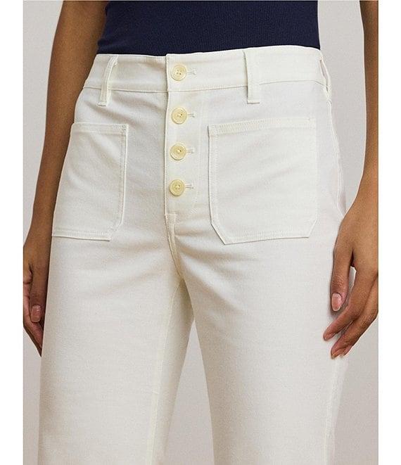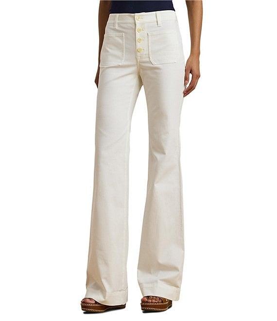 From Lauren Ralph Lauren, these pants feature: Stretch cotton canvas fabrication Wide leg silhouette High-rise waistline Intended to hit below the ankle Belt loops Two front waist patch pockets & two back waist patch pockets Double back waist darts Button fly closure Anchor-engraved pearlized buttons Approx. 33" inseam; 11.25" rise; 24.75" leg opening Cotton/elastane Machine washable or dry clean Imported.