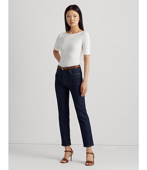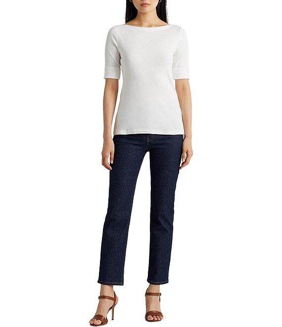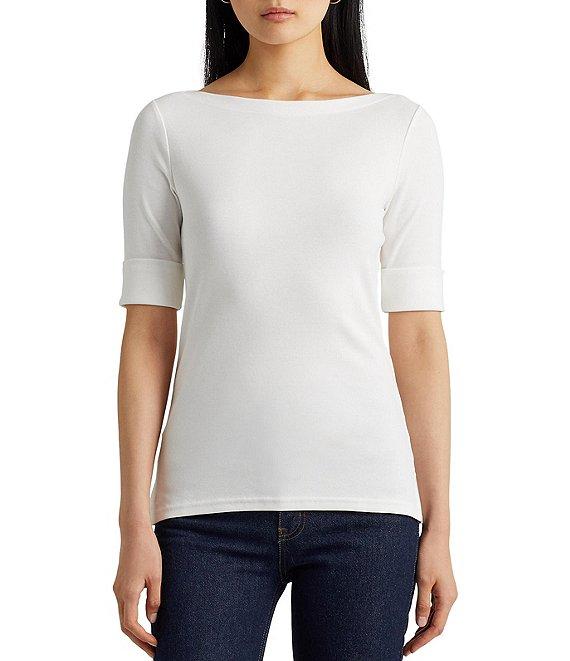 From Lauren Ralph Lauren, this shirt features:Boat necklineElbow short sleeves"LRL" monogram at the right hemSide split hemlinePullover constructionApprox. 25" lengthCotton/elastaneMachine wash/dry flat Imported.From Lauren Ralph Lauren, this timeless wardrobe staple is crafted from a soft cotton blend and features an LRL monogram at the waist for signature Lauren style.
