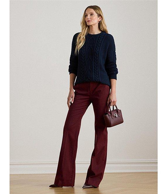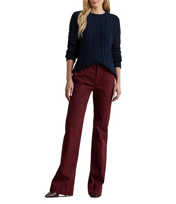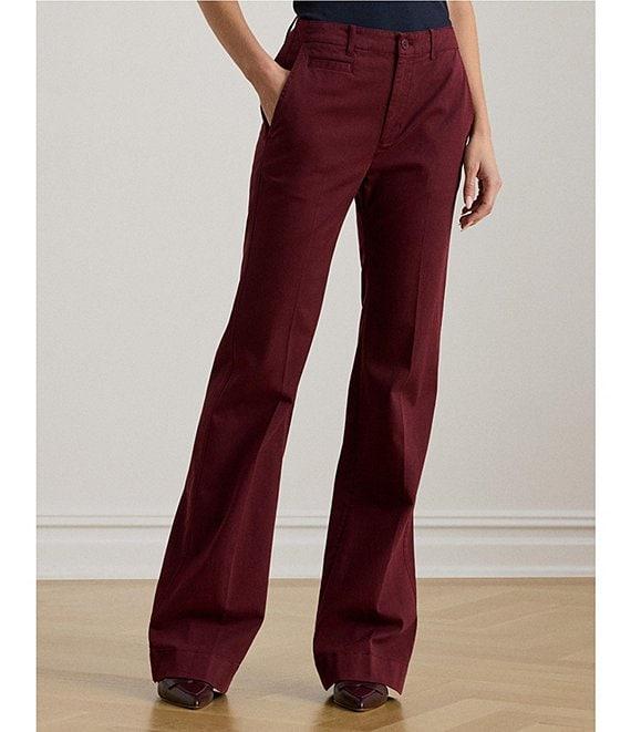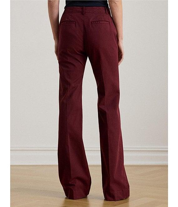 From Lauren Ralph Lauren, these pants feature Stretch cotton chino fabrication Flat front silhouette High rise Belt loops Flare leg 5 pocket styling Slim through the hip and thigh Front button and zipper closure Approx. 31" inseam, 23.75" leg opening, 12" front rise Cotton/elastane Machine wash cold/flat dry or dry clean Imported.
