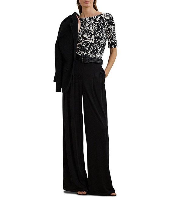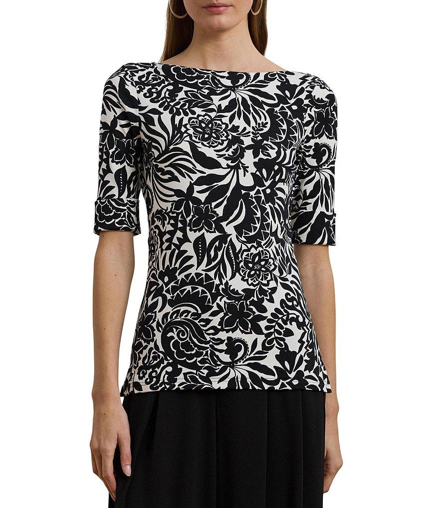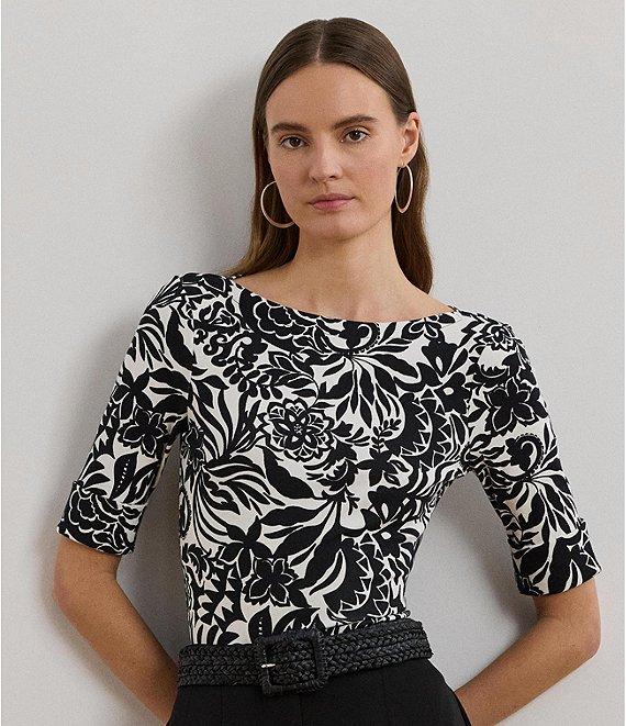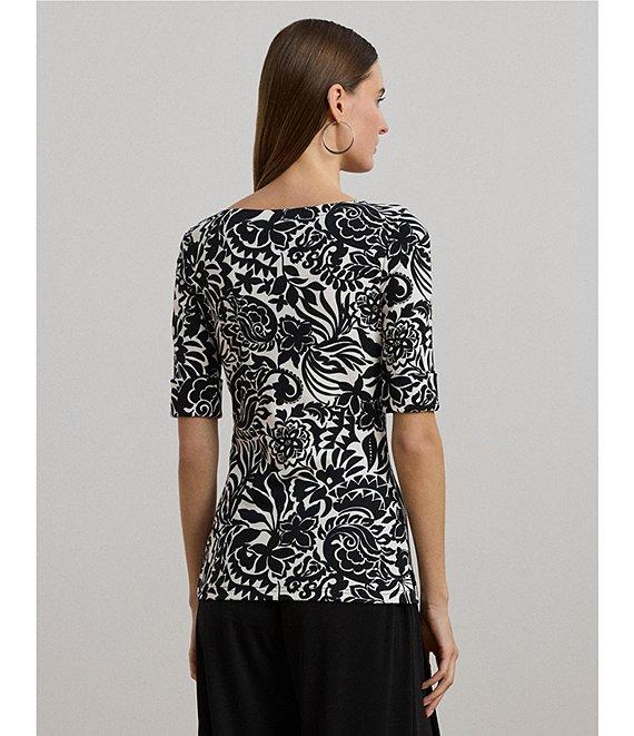 From Lauren Ralph Lauren, this tee features: Stretch knit fabrication Boat neckline Elbow-length sleeves with folded cuffs Two-tone, embroidery-inspired floral motif Slim fit Intended to hit at the hip “LRL”-embroidered logo at the right hem Side-split hem Pullover construction Approx. 25" body length and a 11.5" sleeve length Body length is taken from the high point of the shoulder to hem Cotton/elastane Machine wash Imported.