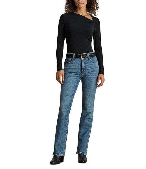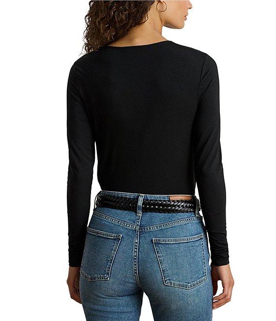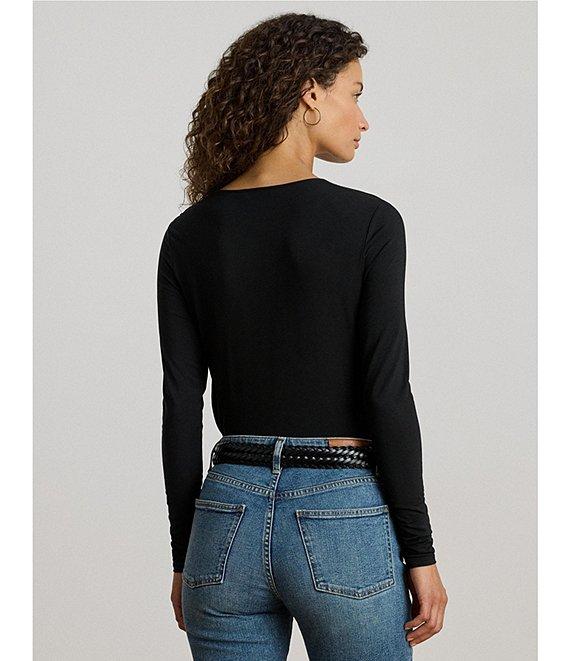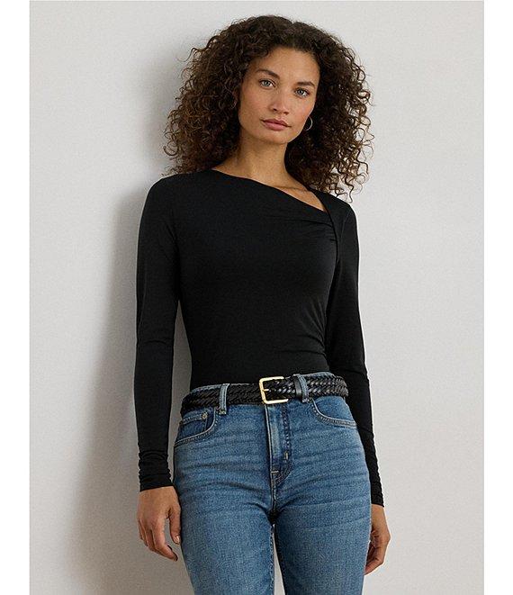 From Lauren Ralph Lauren, this top features: Stretch knit jersey fabrication Asymmetric neckline Long sleeves Pleats gather at the left shoulder Shirring into the left waist Slim fit, intended to hit at the hip Straight hemline Pullover construction Approx. 23.75 length, 24" sleeve length, 025" between sizes Lyocell/elastane Machine wash cold/flat dry or dry clean Imported.