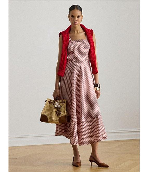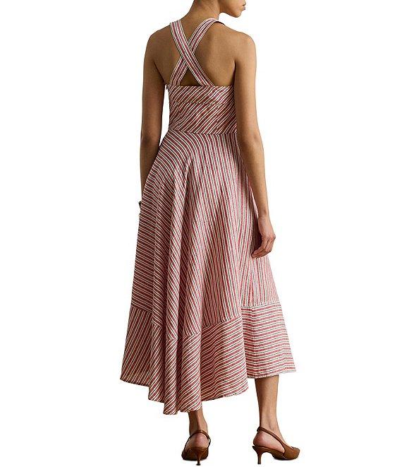 From Lauren Ralph Lauren, this dress features: Voile fabrication Stripe pattern Square neckline Sleeveless with shoulder straps Lined Asymmetrical hemline Concealed left side seam zipper & hook and eye closure Approx. 38.5" length Cotton/linen Machine wash cold or dry clean Imported.