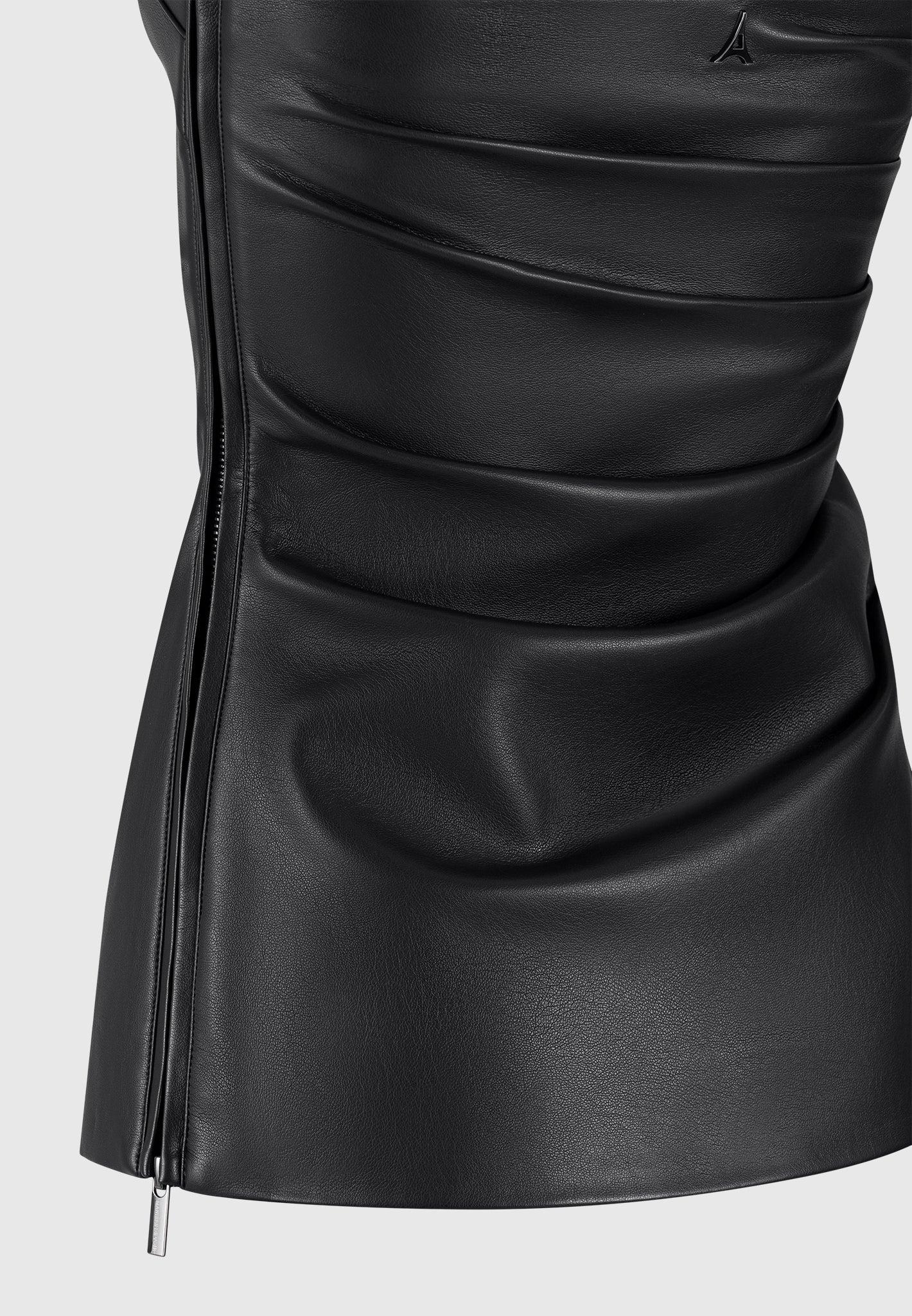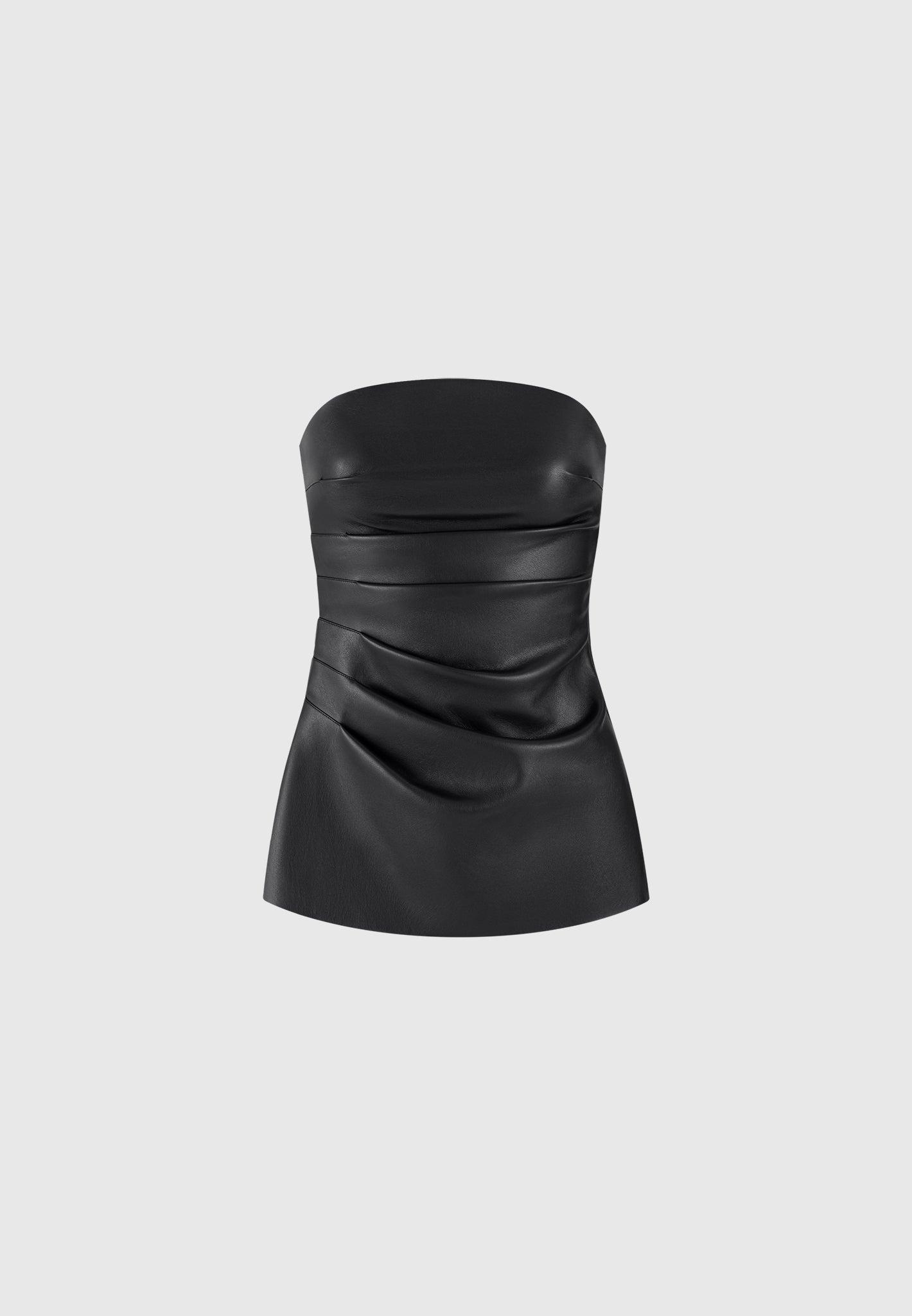 This black vegan leather longline bandeau top features pleat detailing and an asymmetric hem. Made with quality fabric, this top offers a unique and stylish look while also being environmentally friendly. Perfect for those looking for a sustainable and fashionable wardrobe. Fabric: Always check the care label for wash instructions. Model is 5'8", 32.5" Bust, 24" Waist, 32" High Hip, 37.5" Low Hip and Wears UK Size 6 Based on UK Size 6 - Front Length cm/in, Chest cm/in, Sleeve Length cm/in Stretch Factor - /3