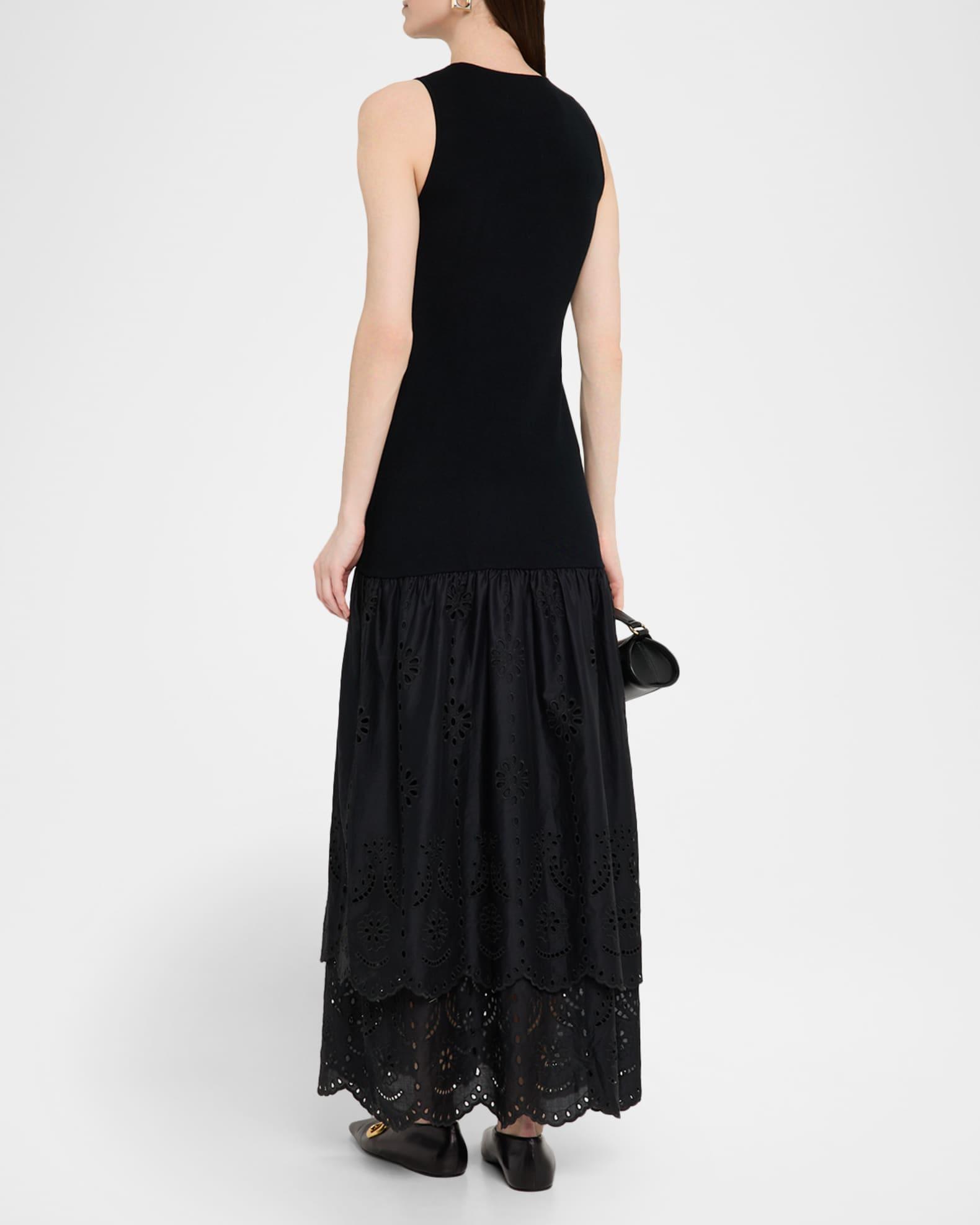 Rails "Lavina" dress consists of a knit bodice that flows into a poplin skirt with eyelet-embroidered trim Approx. 57"L from shoulder to hem Jewel neckline Sleeveless Drop waist Body-skimming fit Full length Slipover style Pbt/cotton Unlined Hand wash, low iron if needed, line dry in shade, do not dry clean Imported