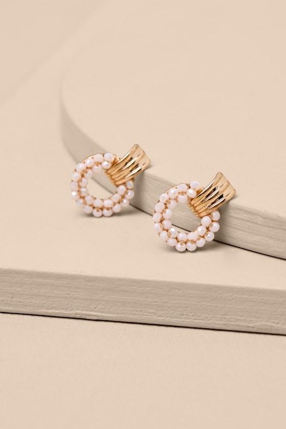 A simple yet impressive design, these dainty gold-toned earrings are bound to be admired by everyone you encounter. The classic doorknocker-inspired silhouette features a ribbed-like texture across the posts and small white beads that adorn the inner rings. Style with an updo for maximum compliments!