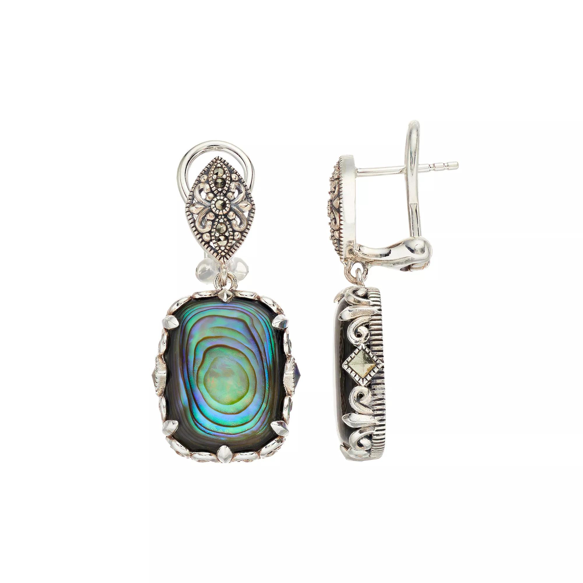 Add a unique touch to your everyday wardrobe with these stylish Lavish by TJM drop earrings. Add a unique touch to your everyday wardrobe with these stylish Lavish by TJM drop earrings. Metal: sterling silver Closures: omega Packaging: boxed Finish: oxidized Length: 1.24 in.STONE DETAILS Stone type: abalone, marcasite Center stone size: 16 mm x 12 mm Shape: cushion cut Setting: prong Gemstones may have been treated to enhance their appearance. Special care may be required. Please visit our Gemstone Treatment & Special Care Guide for more information. Please note, due to the high value of this item, a signature may be required upon delivery. Color: Blue. Gender: female. Age Group: adult.