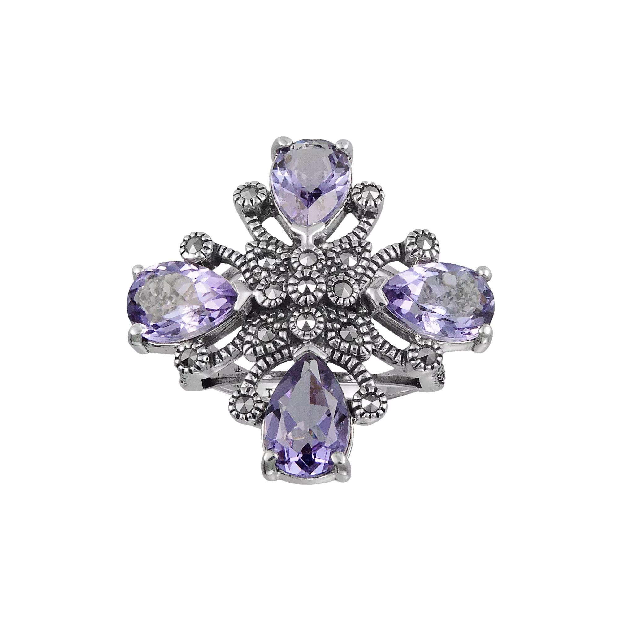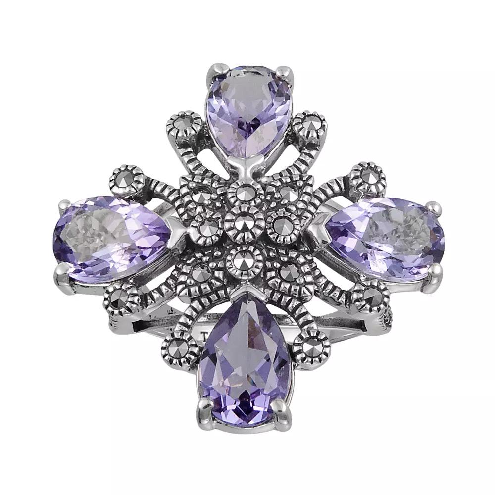 Genuine amethyst and marcasite stones adorn this flower ring for a lavish look.Ring Details: Ring width: 0.84 in. Metal: sterling silver Features: milgrain detailsStone Details: Stone type: genuine amethyst, marcasite Cut: pear Setting: prong Color: Purple. Gender: female. Age Group: adult.