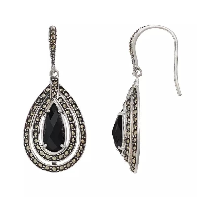 You'll love the impressive design of these earrings from Lavish by TJM. You'll love the impressive design of these earrings from Lavish by TJM. Backings: Frenchwire Length: 1.50 in. Packaging: boxed Additional details: nickel free Plating: rhodium Finish: polished Base material: sterling silver STONE DETAILS Type: Onyx Center stone weight: 2 1/10 ct. Center stone size: 12 mm x 5 mm Setting: Prong Shape: Pear Color: Black Gemstones may have been treated to enhance their appearance. Special care may be required. Gender: female. Age Group: adult.