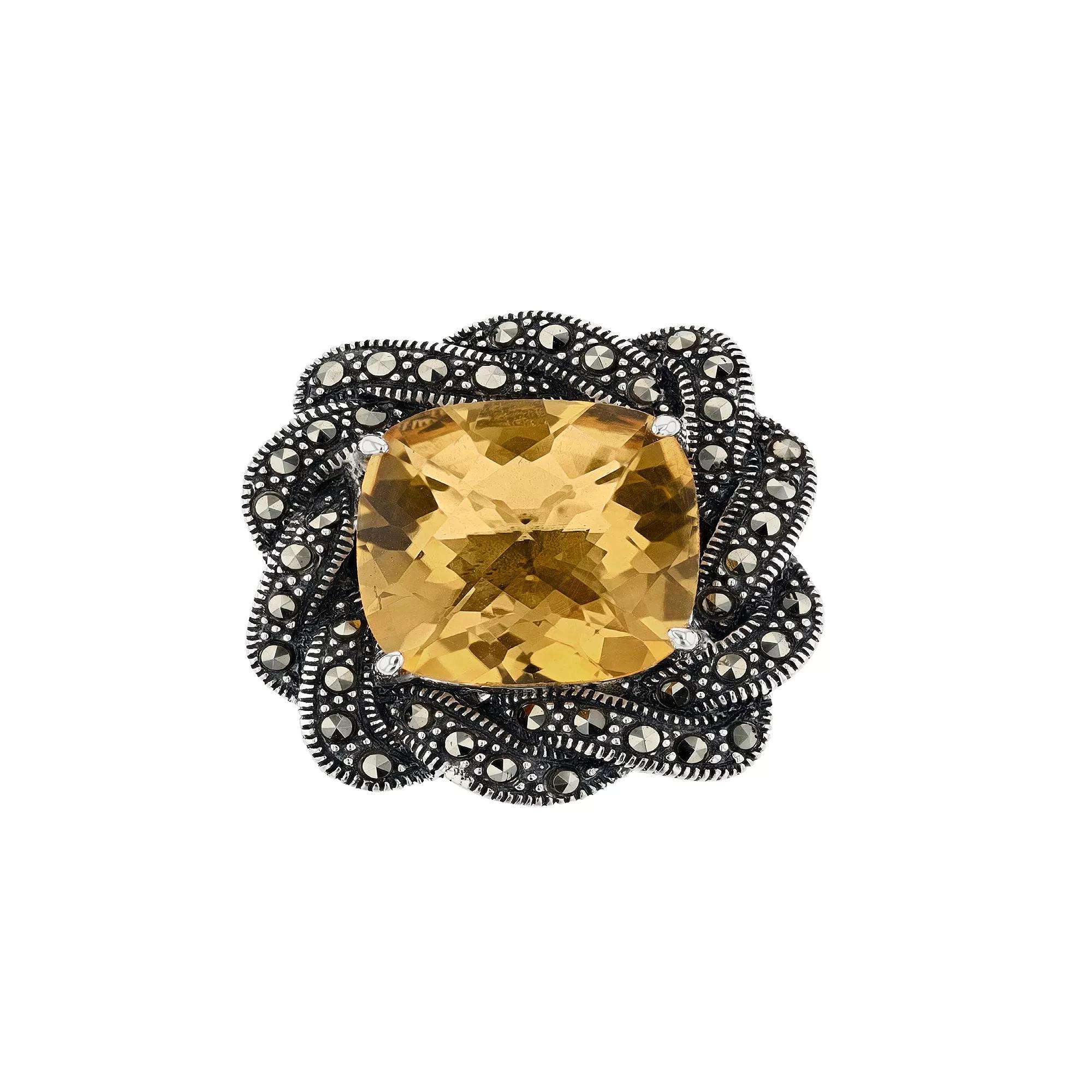For style that makes a statement, accessorize with this sterling silver citrine and marcasite ring from Lavish by TJM. For style that makes a statement, accessorize with this sterling silver citrine and marcasite ring from Lavish by TJM. Nickel free Marcasite accents Metal: sterling silver Plating: rhodium Packaging: boxed Width: 0.8 in. Finish: polishedSTONE DETAILS Stone type: citrine Total weight: 6.85 ct. Center stone size: 13 mm x 13 mm Shape: cushion cut Setting: prong Color: Yellow. Gender: female. Age Group: adult.