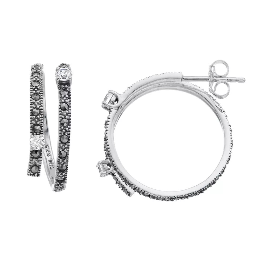 Add a stylish touch to your favorite outfits when you wear these marcasite hoop earrings. Add a stylish touch to your favorite outfits when you wear these marcasite hoop earrings. Length: 1.02 in. Backings: post Nickel free Metal: sterling silver Plating: rhodium Finish: oxidized Marcasite accents Packaging: boxedSTONE DETAILS Stone type: cubic zirconia Total weight: 7/8 ct. Center stone weight: 1/8 ct. Center stone size: 3.00 mm Shape: oval Setting: prong Gemstones may have been treated to enhance their appearance. Special care may be required. Please visit our Gemstone Treatment & Special Care Guide for more information. Please note, due to the high value of this item, a signature may be required upon delivery. Color: White. Gender: female. Age Group: adult.