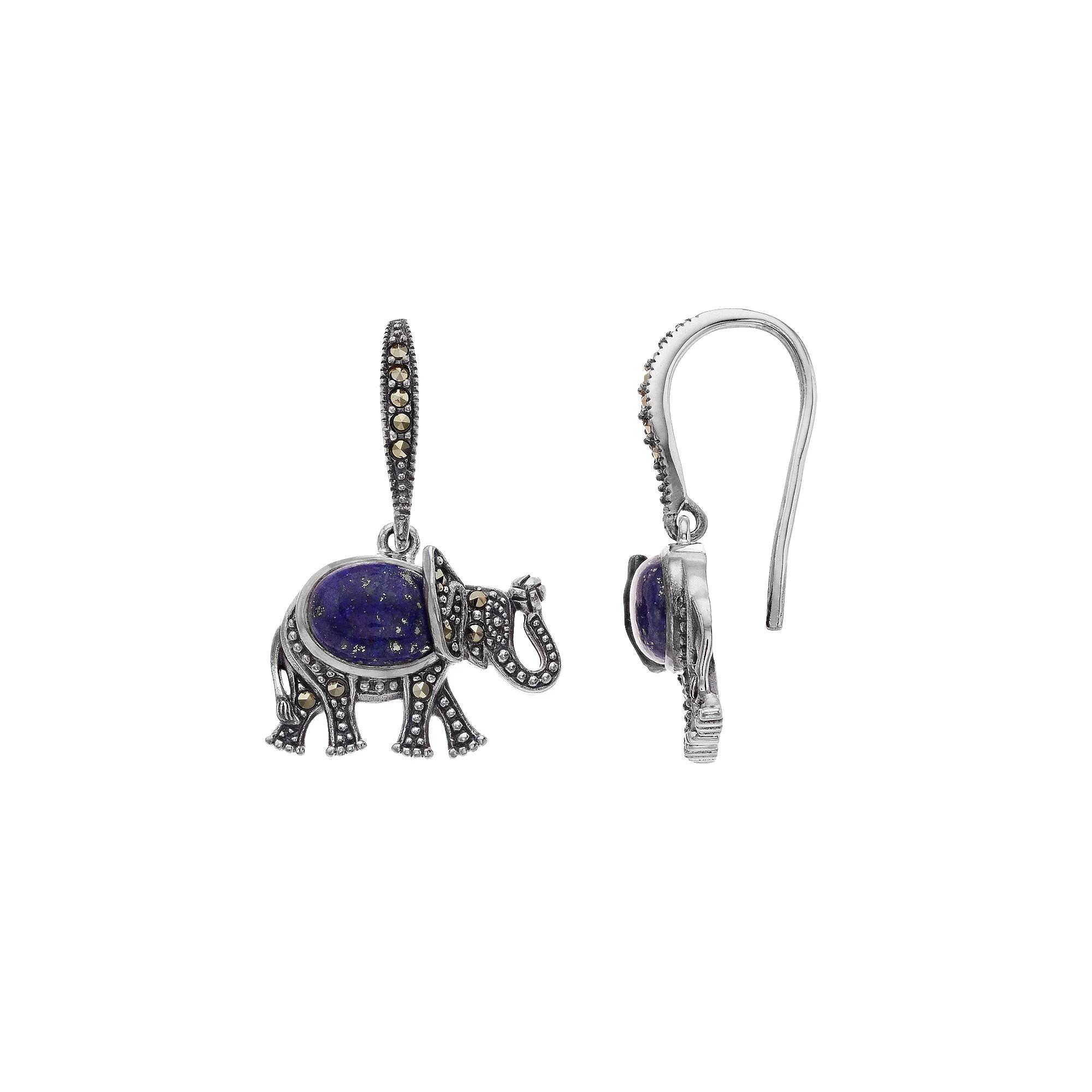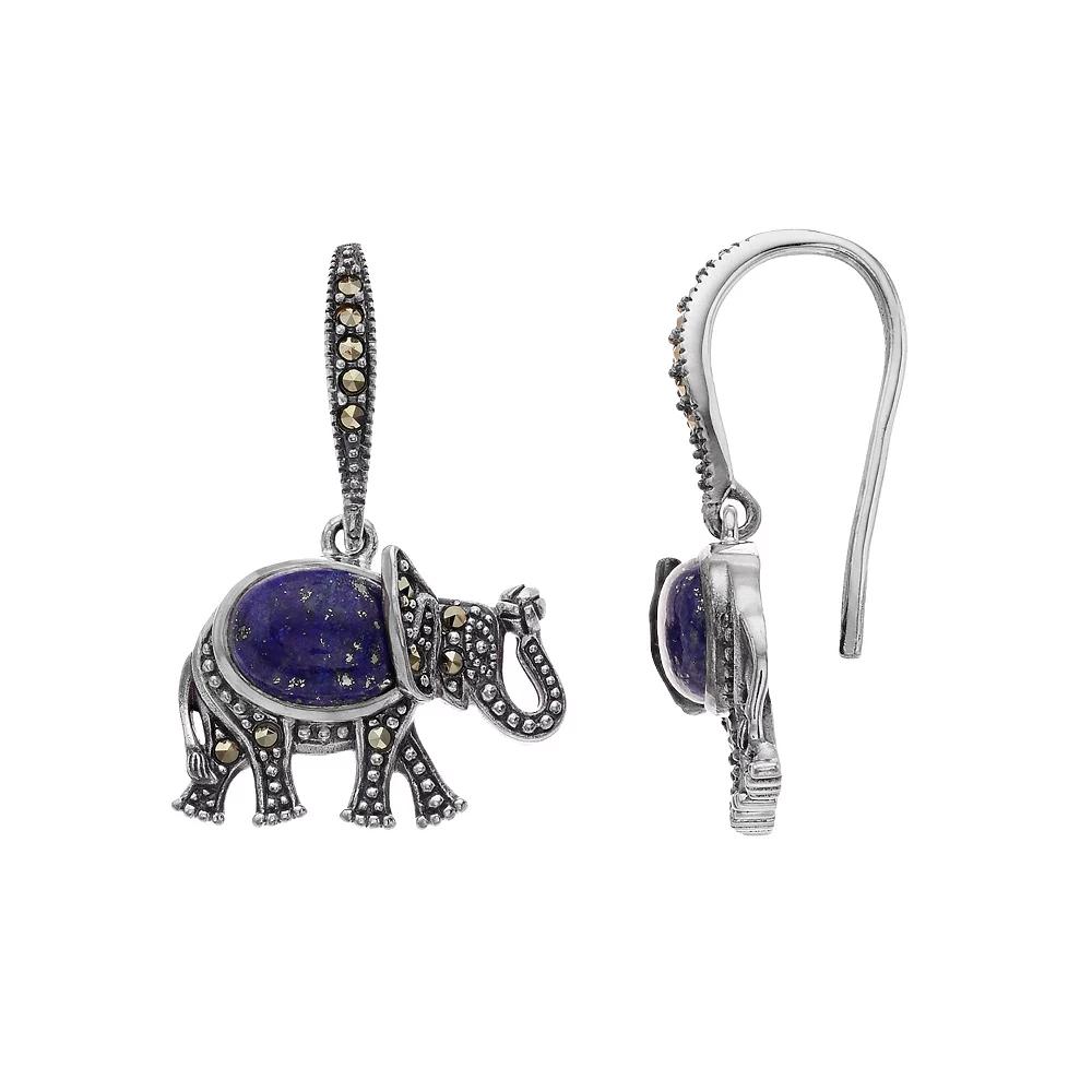 Enhanced with lapis lazuli center stones and marcasite accents, these Lavish by TJM elephant earrings are a fun and fashionable pair. Enhanced with lapis lazuli center stones and marcasite accents, these Lavish by TJM elephant earrings are a fun and fashionable pair. Marcasite accents Metal: sterling silver Backings: Frenchwire Plating: rhodium Packaging: boxed Finish: polished Earring length: 1.03 in.STONE DETAILS Stone type: lapis lazuli Total weight: 1.19 ct. Center stone size: 8 mm x 6 mm Shape: oval cabochon Color: Purple. Gender: female. Age Group: adult.