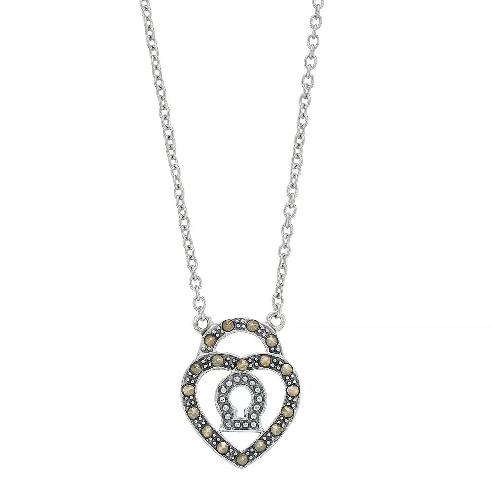 Unlock a dazzling look when you wear this charming Lavish by TJM heart lock pendant. Unlock a dazzling look when you wear this charming Lavish by TJM heart lock pendant. Metal: sterling silver Chain length: 18 in. Packaging: boxed Finish: oxidized Pendant size: 0.69"L x 0.55"W Chain type: cableSTONE DETAILS Center stone weight: 1/10 ct. Shape: round Setting: micro pave Stone type: marcasite Center stone size: 1.35 mm Gemstones may have been treated to enhance their appearance. Special care may be required. Please visit our Gemstone Treatment & Special Care Guide for more information. Please note, due to the high value of this item, a signature may be required upon delivery. Size: 18". Color: Grey. Gender: female. Age Group: adult.