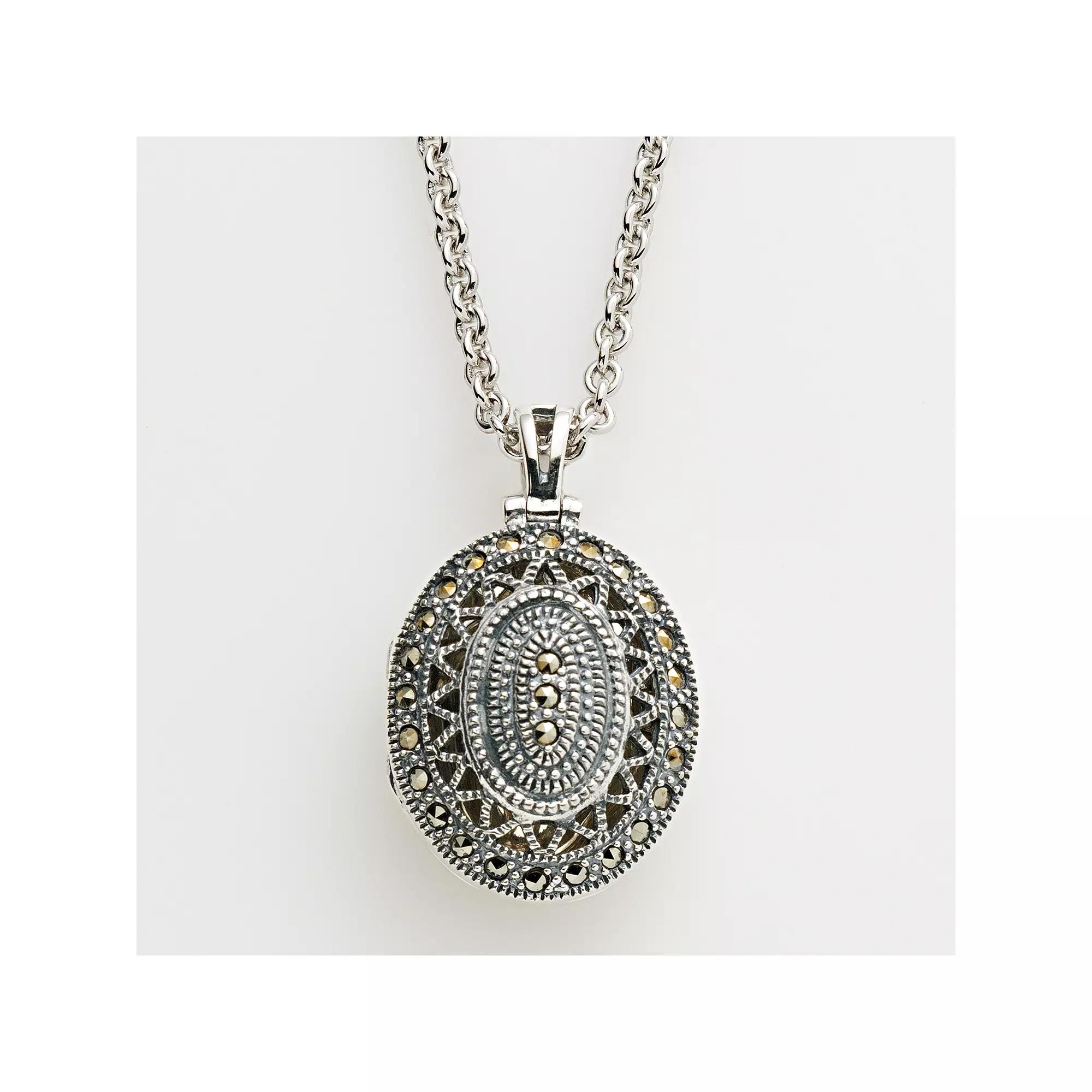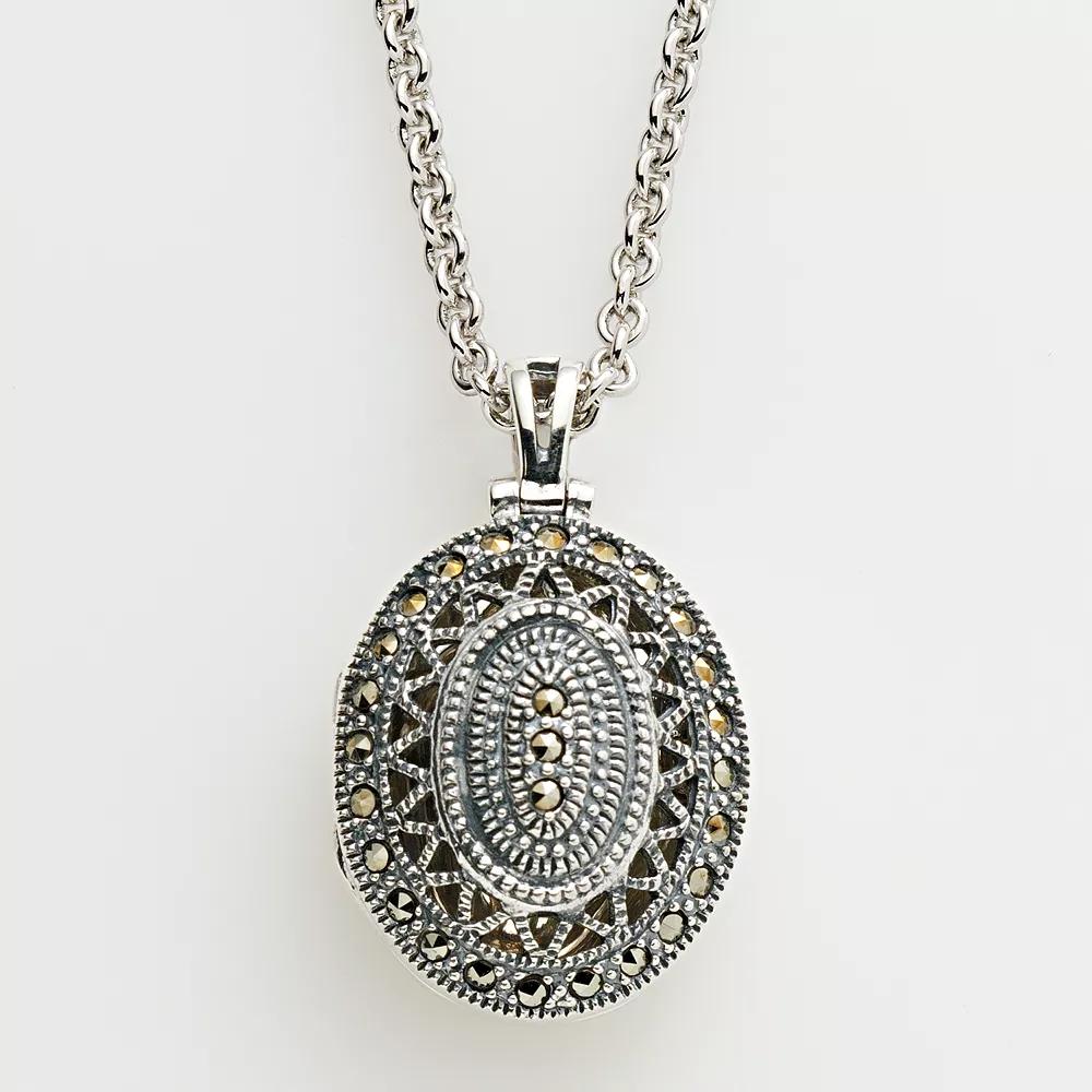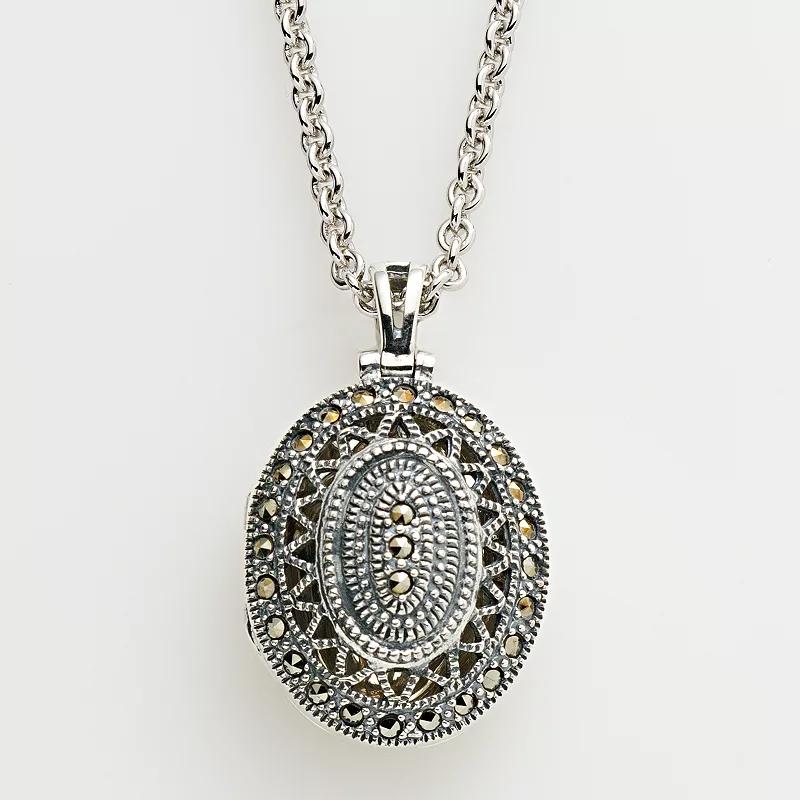 This oval locket is stunning. Marcasite stones make its open-worked design shimmer with beauty. Keep your memories close with this sterling silver necklace. Locket opens to reveal space for one photo. Beaded milgrain details create an ornate look. Details: 1 1/8-in. locket 18-in. chain Lobster-claw clasp Sterling silver Size: One Size. Color: Grey. Gender: female. Age Group: adult.