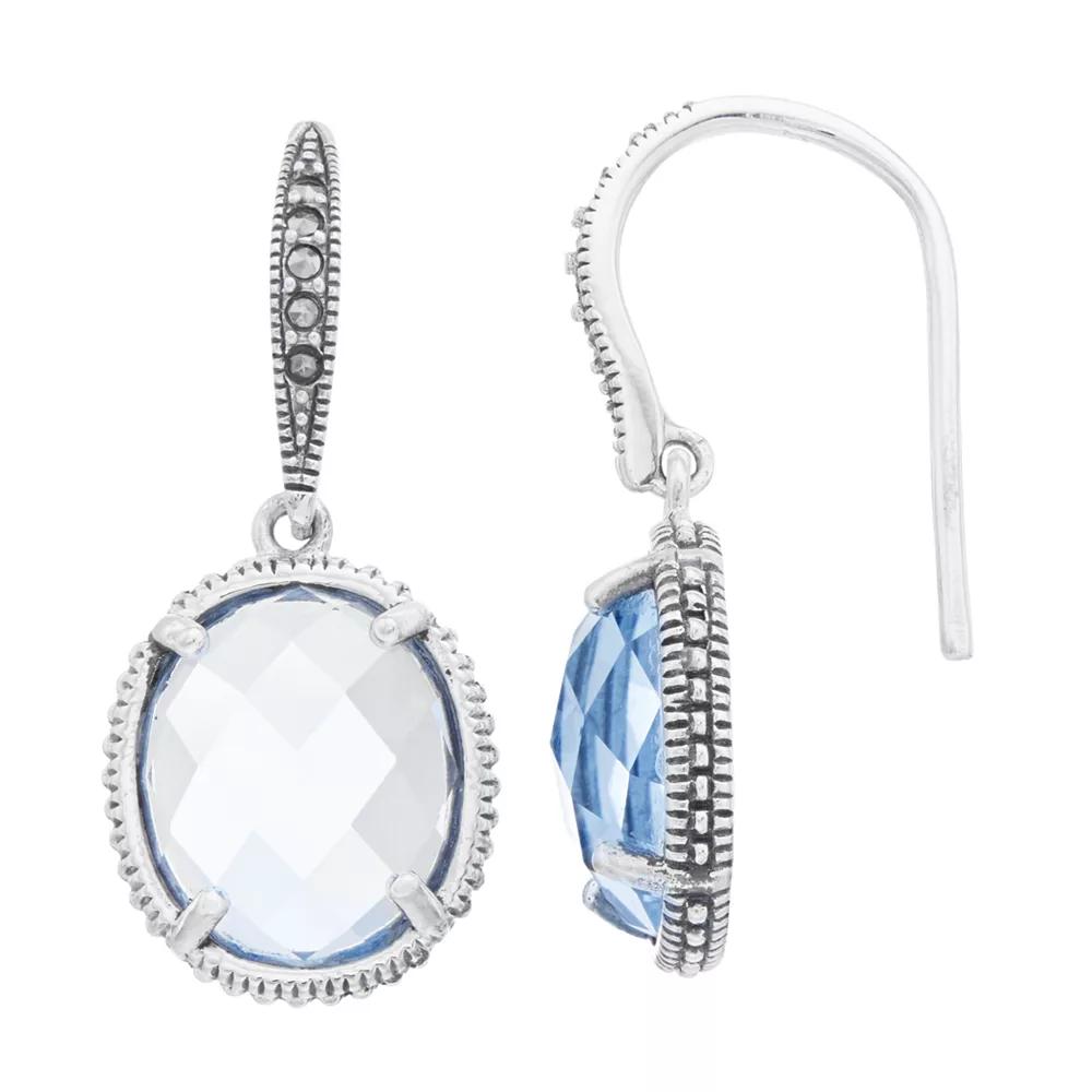 Decorated with lab-created blue quartz gemstones and marcasite accents, these sterling silver drop earrings offer stunning style. Decorated with lab-created blue quartz gemstones and marcasite accents, these sterling silver drop earrings offer stunning style. Length: 1.03 in. Backings: Frenchwire Nickel free Metal: sterling silver Plating: rhodium Finish: oxidized Marcasite accents Packaging: boxedSTONE DETAILS Stone type: lab-created blue quartz Total weight: 3 3/8 ct. Center stone weight: 3 1/3 ct. Center stone size: 12 mm x 10 mm Shape: oval Setting: prong Gemstones may have been treated to enhance their appearance. Special care may be required. Please visit our Gemstone Treatment & Special Care Guide for more information. Please note, due to the high value of this item, a signature may be required upon delivery. Gender: female. Age Group: adult.