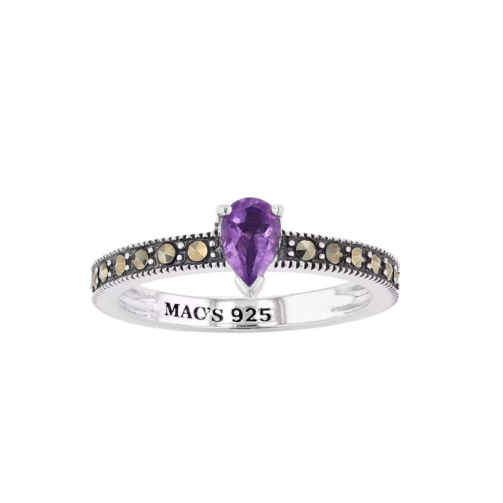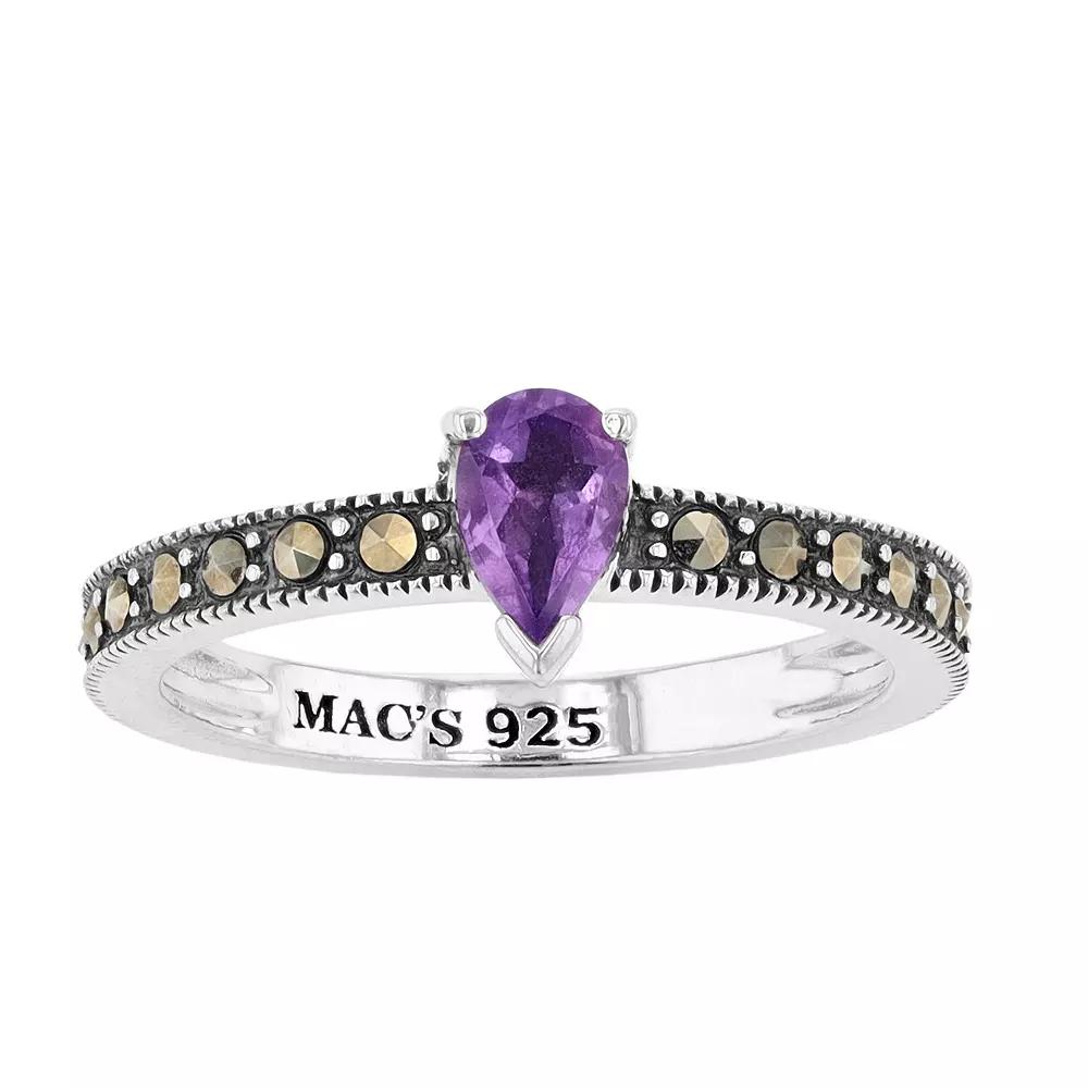 Complete your look with this Lavish by TJM ring. Featuring a pear-shaped amethyst accented with marcasite along the band, it's a uniquely stylish complement to your wardrobe. Metal: sterling silver Packaging: boxed Width: 0.99 in. Finish: oxidizedSTONE DETAILS Stone type: amethyst, marcasite Total weight: 3/8 ct. Center stone weight: 1/3 ct. Center stone size: 6 mm x 4 mm Shape: pear Setting: prong Gemstones may have been treated to enhance their appearance. Special care may be required. Please visit our Gemstone Treatment & Special Care Guide for more information. Please note, due to the high value of this item, a signature may be required upon delivery. Color: Purple. Gender: female. Age Group: adult.