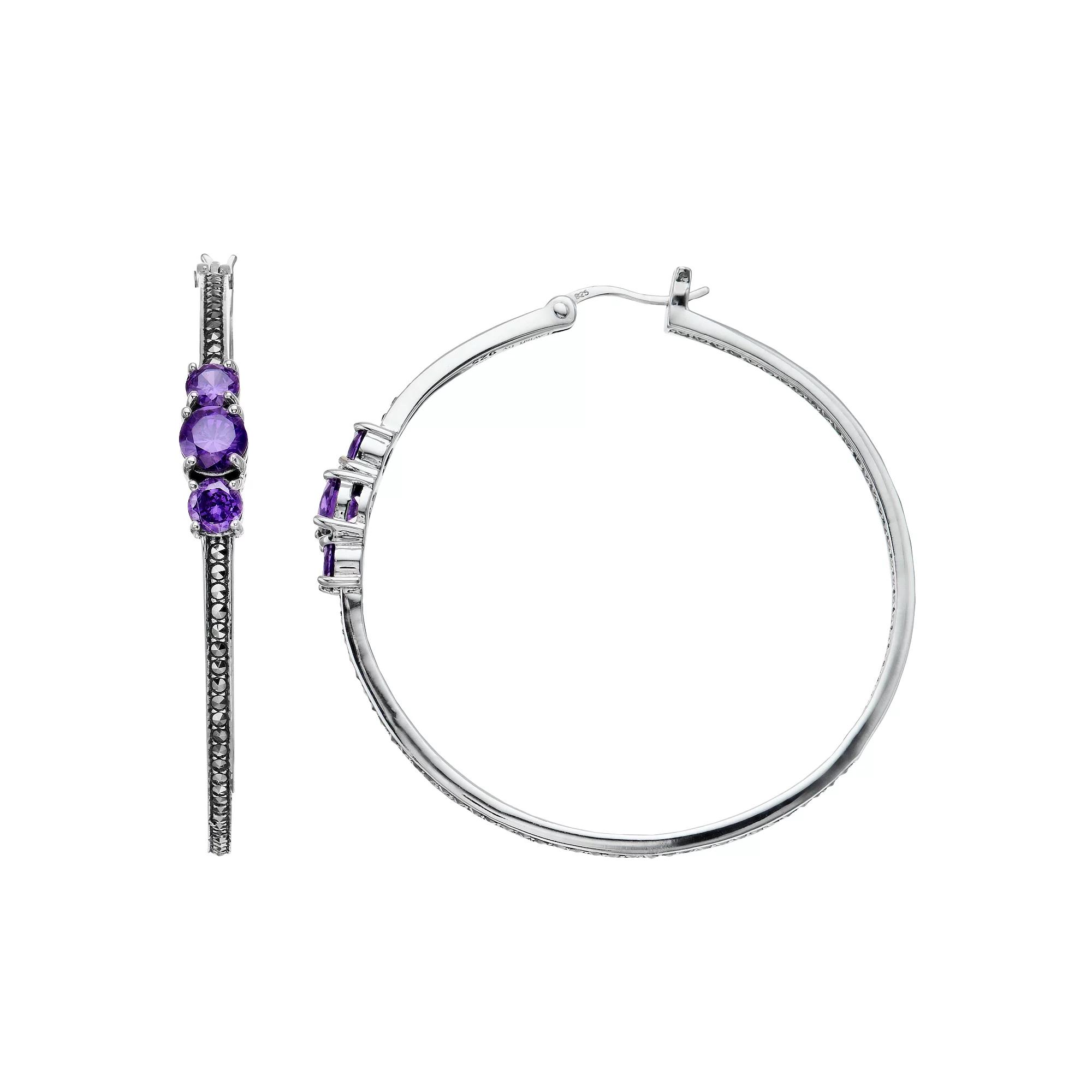 Add the perfect finishing touch to your ensemble with these Lavish by TJM Sterling Silver Purple Cubic Zirconia & Marcasite Hoop Earrings. Click on this JEWELRY & WATCHES GUIDE to learn about fit, styles, materials and more! Add the perfect finishing touch to your ensemble with these Lavish by TJM Sterling Silver Purple Cubic Zirconia & Marcasite Hoop Earrings. Click on this JEWELRY & WATCHES GUIDE to learn about fit, styles, materials and more! FEATURES Dimensions: 44.75 x 45.75 mm Backings: clip-on Nickel free Metal: sterling silver Finish: oxidized Packaging: boxedSTONE DETAILS Stone type: cubic zirconia Total weight: 5 ct. Center stone weight: 1 3/4 ct. Center stone: 5 mm Shape: round Setting: prong Size: One Size. Gender: female. Age Group: adult.