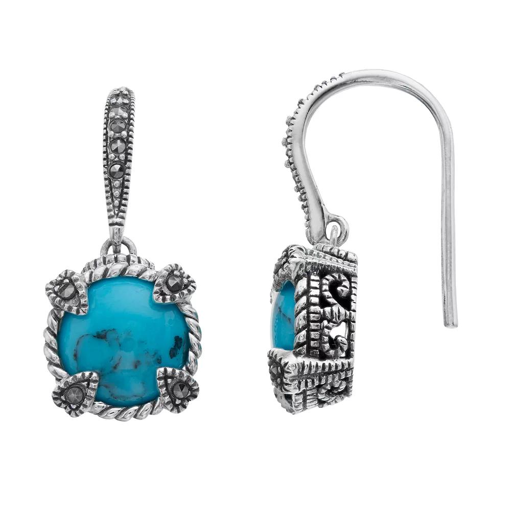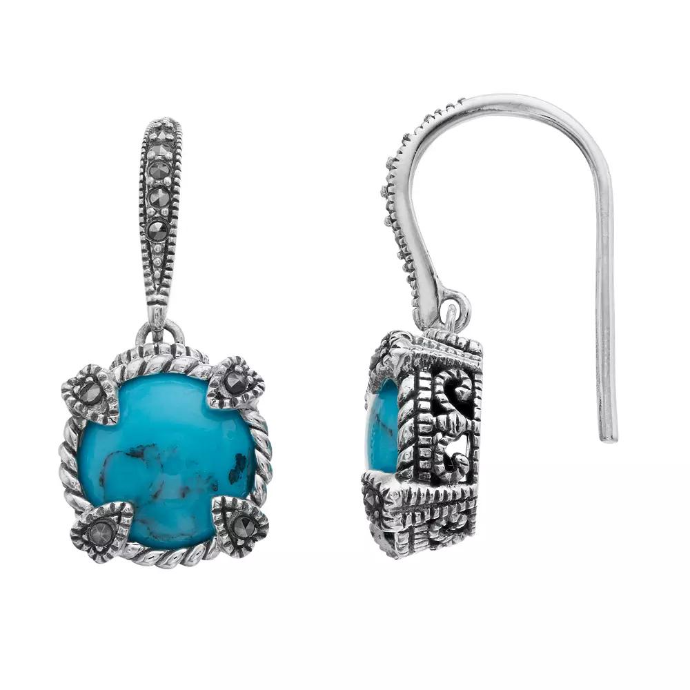 You will love the unique design of these Lavish by TJM simulated turquoise and marcasite dangle earrings. Click on this JEWELRY & WATCHES GUIDE to learn about fit, styles, materials and more! You will love the unique design of these Lavish by TJM simulated turquoise and marcasite dangle earrings. Click on this JEWELRY & WATCHES GUIDE to learn about fit, styles, materials and more! FEATURES Length: 25.40 mm x 11.40 mm Backings: Frenchwire Metal: sterling silver Plating: rhodium Finish: oxidized Packaging: boxed Nickel freeSTONE DETAILS Stone type: simulated turquoise Total weight: 4 1/4 ct. Center stone weight: 4 ct. Center stone size: 9 mm Shape: round Setting: prong Color: Blue. Gender: female. Age Group: adult.