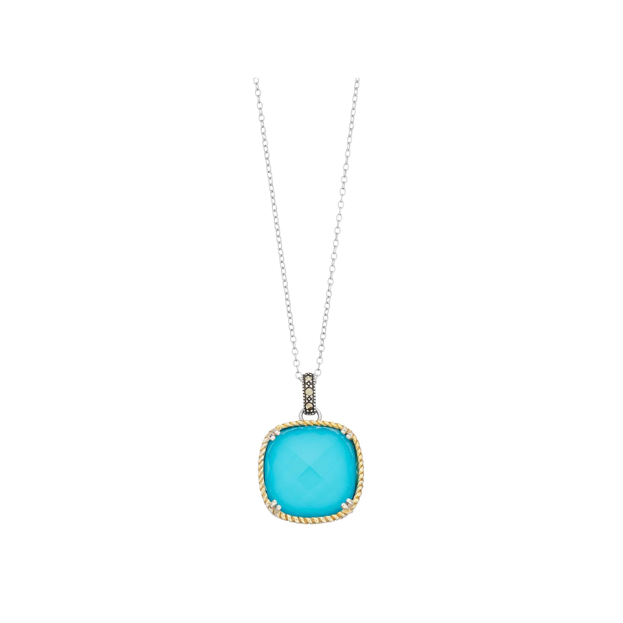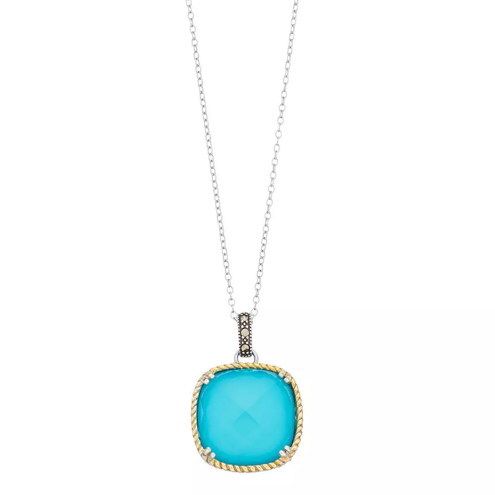 This gorgeous sterling silver simulated turquoise pendant necklace is the perfect way to finish any outfit. This gorgeous sterling silver simulated turquoise pendant necklace is the perfect way to finish any outfit. Pendant size: 1.60"L x 0.44"W Chain length: 16 in. Chain type: rolo Metal: sterling silver Plating: rhodium Finish: oxidized Packaging: boxedSTONE DETAILS Stone type: simulated turquoise Total weight: 10.74 ct. Shape: cushion cut Setting: prong Gemstones may have been treated to enhance their appearance. Special care may be required. Please visit our Gemstone Treatment & Special Care Guide for more information. Please note, due to the high value of this item, a signature may be required upon delivery. Size: 16". Color: Blue. Gender: female. Age Group: adult.