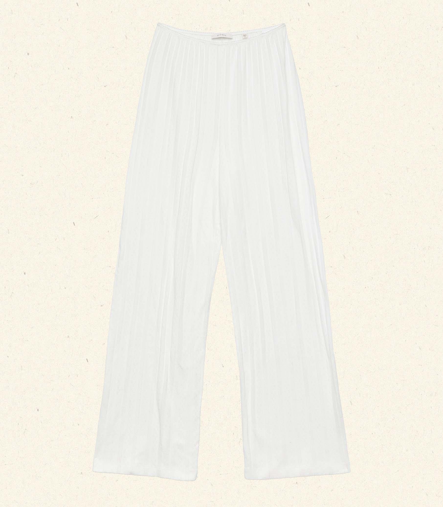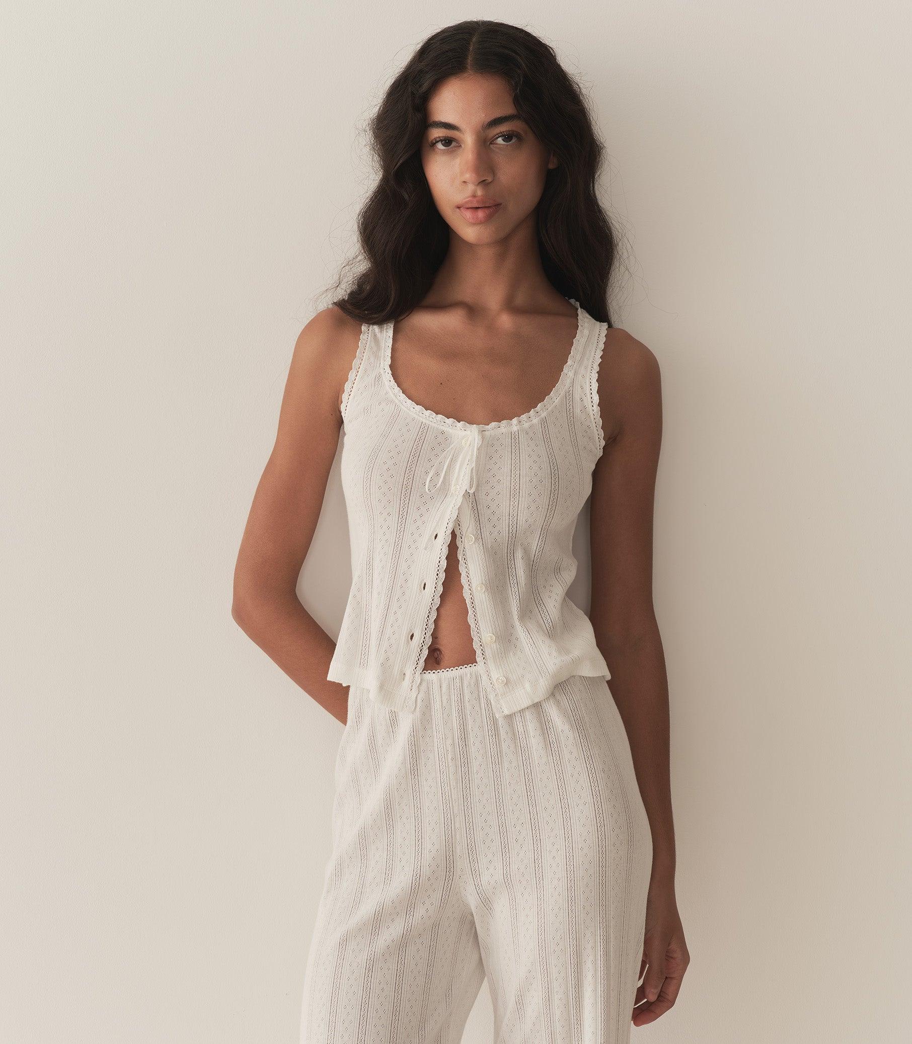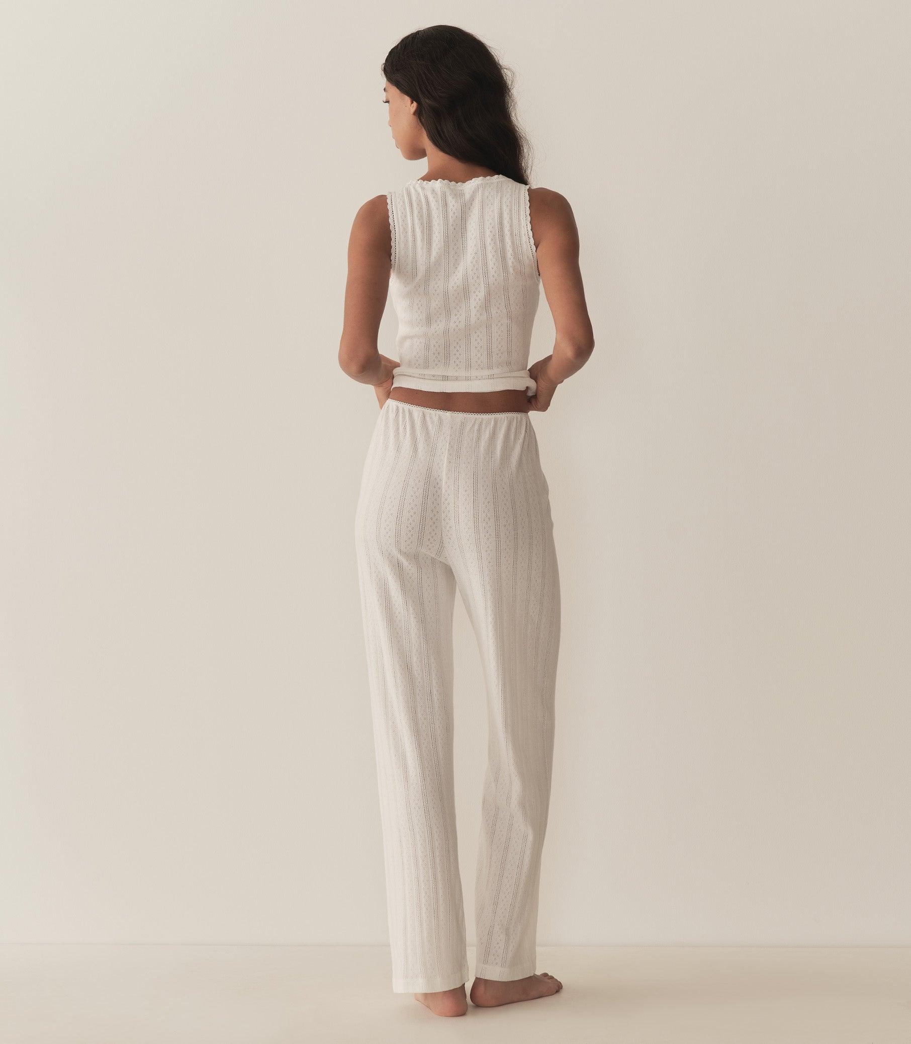 Reimagined in our signature soft organic cotton pointelle, the Lavon Pointelle Pant is an effortless pull-on style with a wide leg and high waist trimmed with elastic scallop detailing.