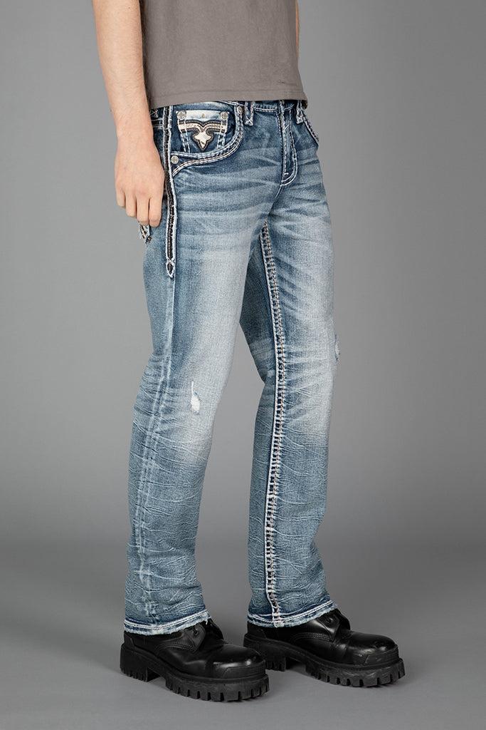 Timeless in form. The Lawrence Straight Jeans redefine men’s premium straight-leg denim with quiet confidence. Crafted from premium stretch denim, this classic straight fit offers versatility and all-day wearability. The silhouette remains sharp yet flexible, engineered for movement without compromise. Intricate stitching and subtle distressing add depth without excess, while the 'R' back pocket design offers a modern evolution of Rock Revival’s signature craftsmanship. Finished with custom pewter buttons and rivets, along with a metal-engraved “Rock Revival” leather patch. Built for longevity. A statement. A standard. Details: Men’s straight-leg jeans, structured yet versatile Premium stretch denim, engineered for movement 'R' back pocket design, a modern mark of distinction Custom pewter buttons and rivets Metal-engraved “Rock Revival” patch Designed in Los Angeles, California