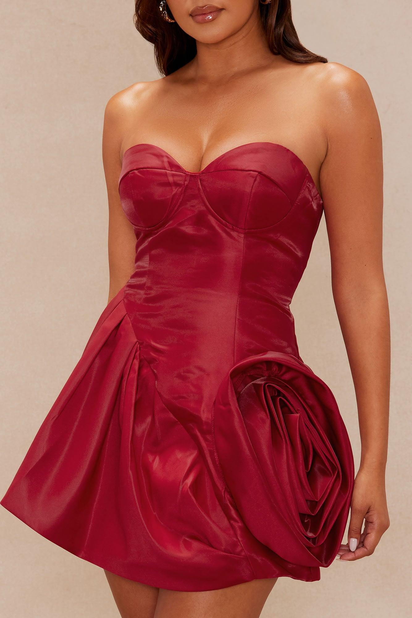 Available In Burgundy. Taffeta Mini Dress Strapless Sweetheart Neckline Grip Tape Padded Bra Cups Underwire 3D Floral Applique Hidden Back Zipper Closure Lined Non Stretch Shell/Lining: 100% Polyester Imported