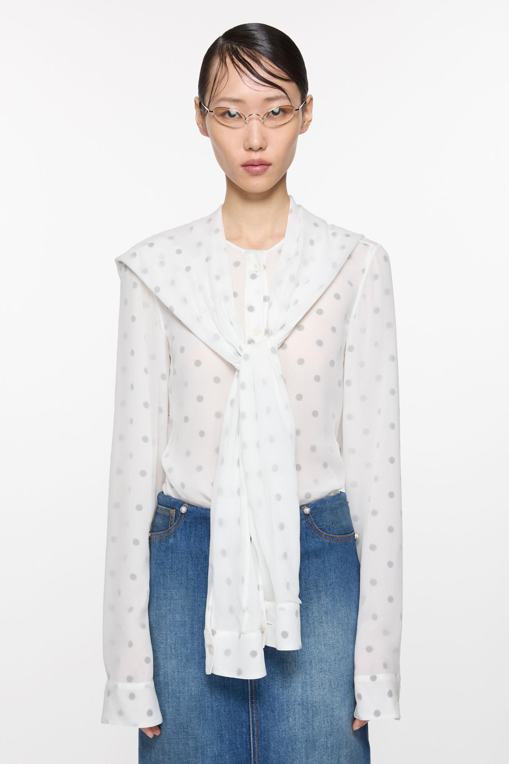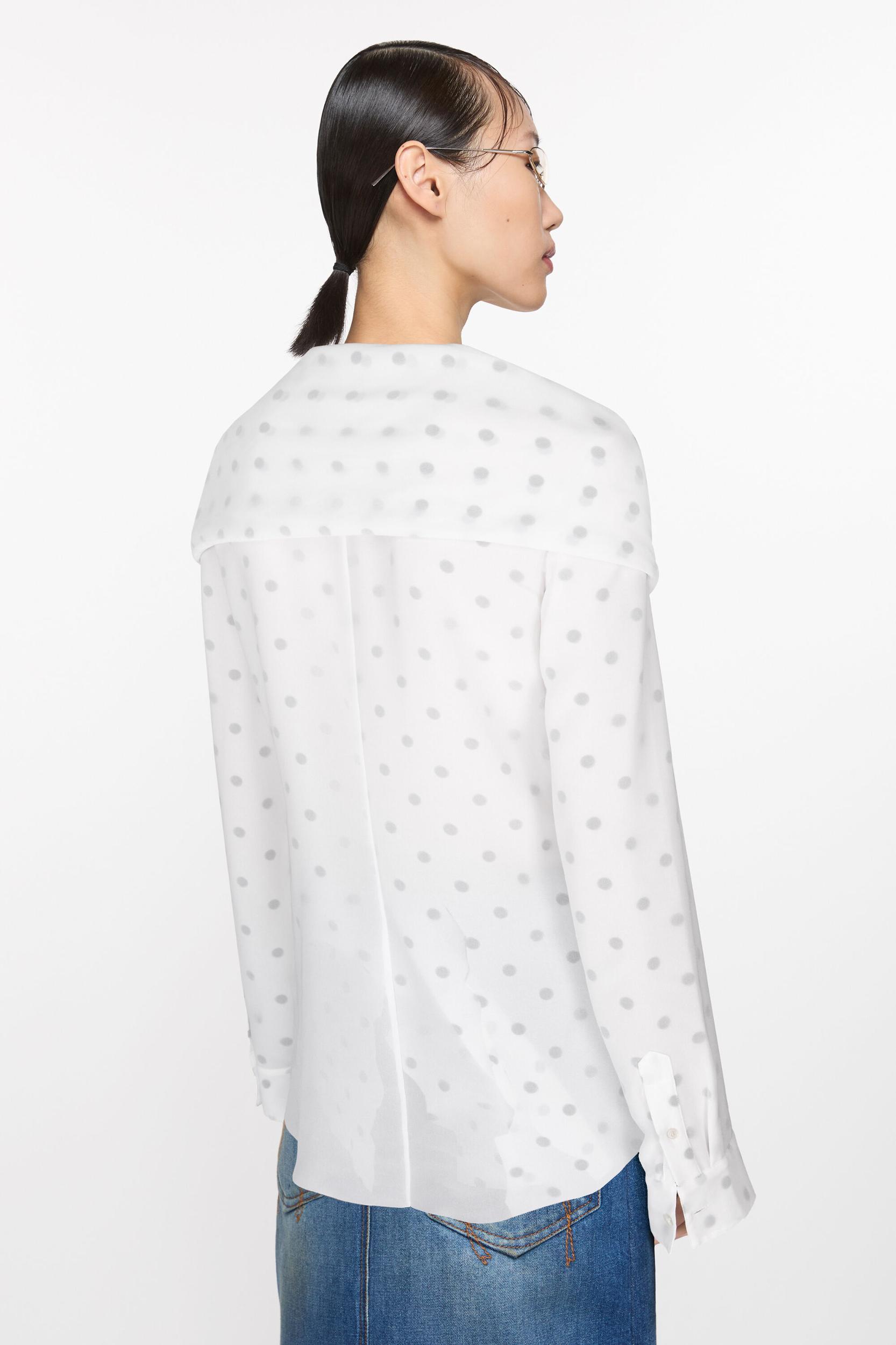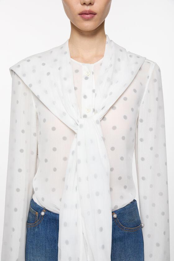 Blouse re-imagines a classic button-up shirt with a constructed wrapped sleeve detailing at the neckline. Adorned with seasonal polka dot artwork with shredded cuts and double-layered mesh design. Cut to a relaxed fit and below hip length. FN-WN-BLOU001137