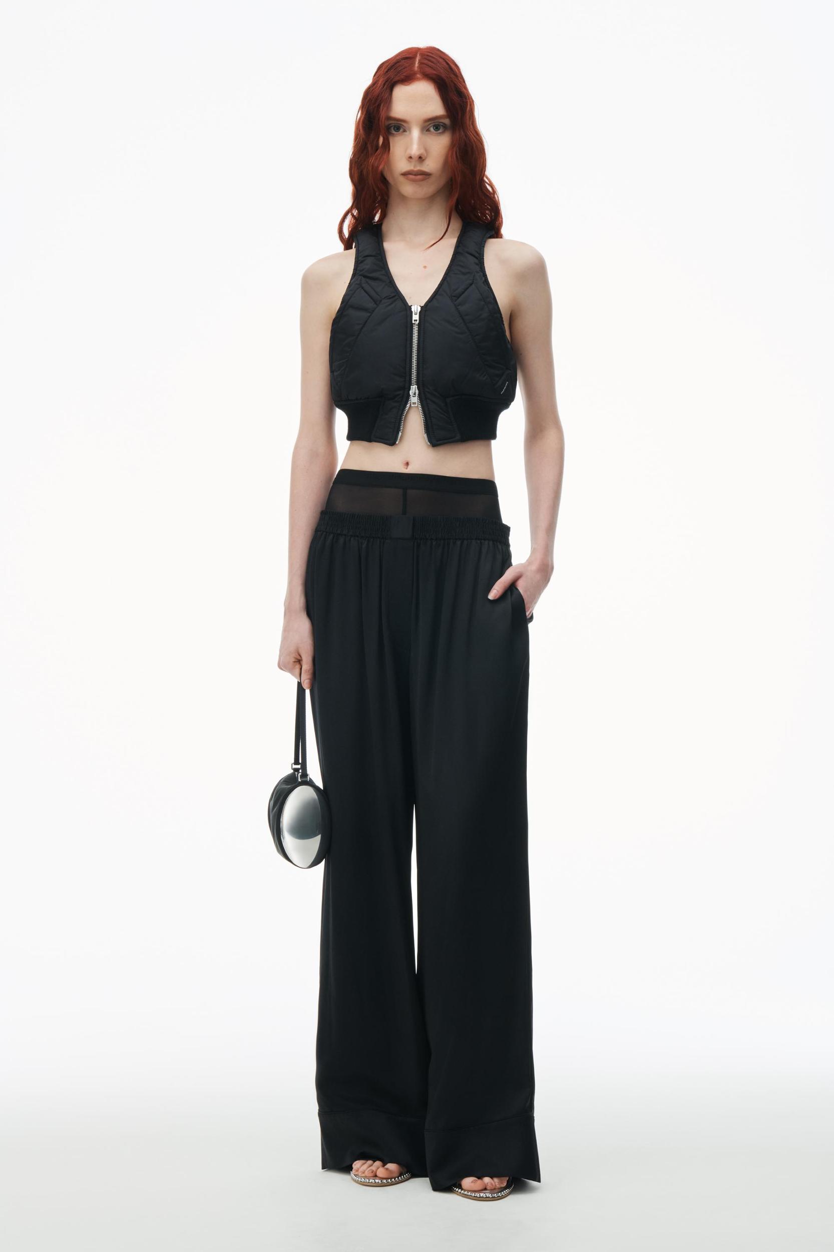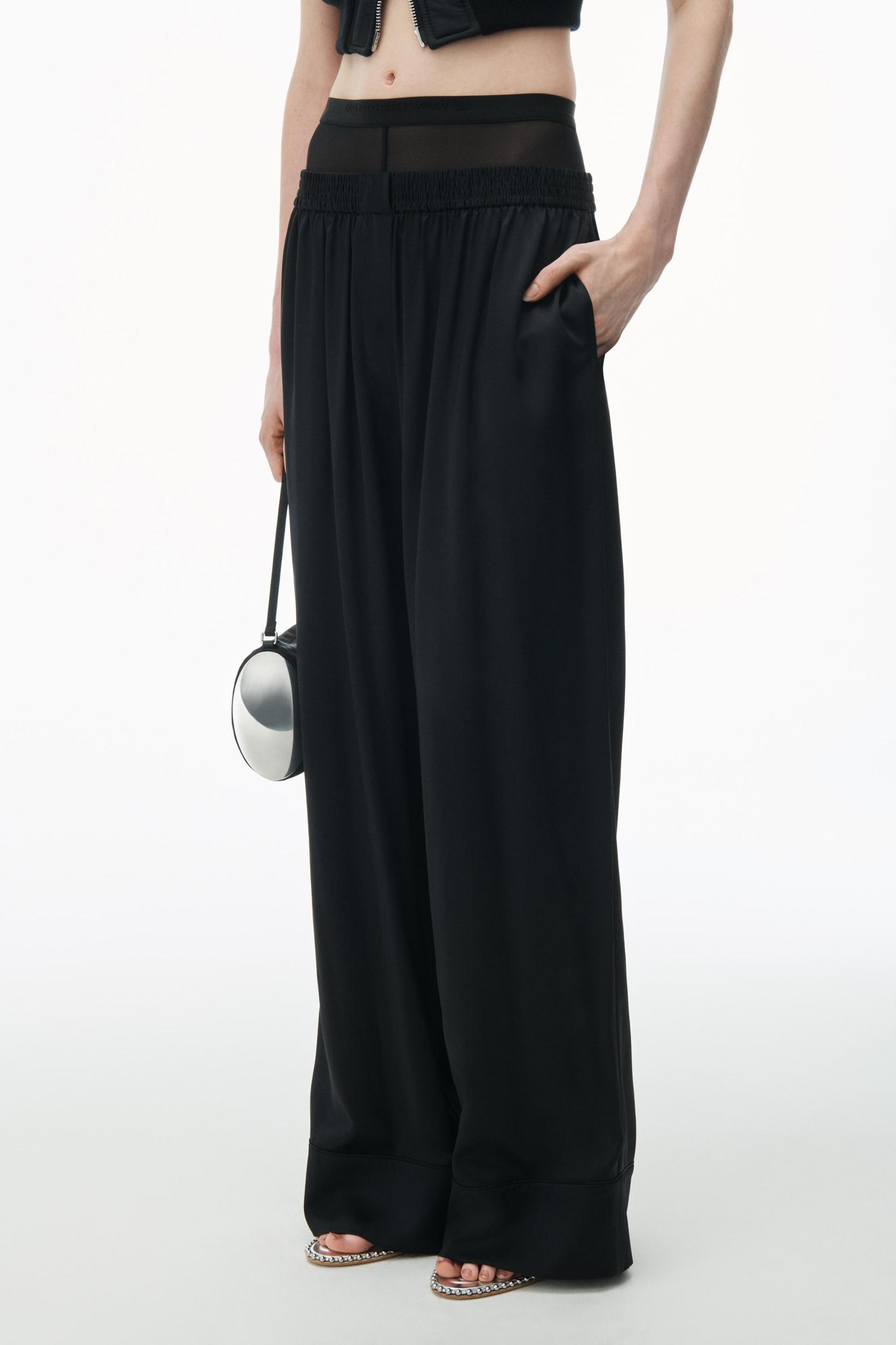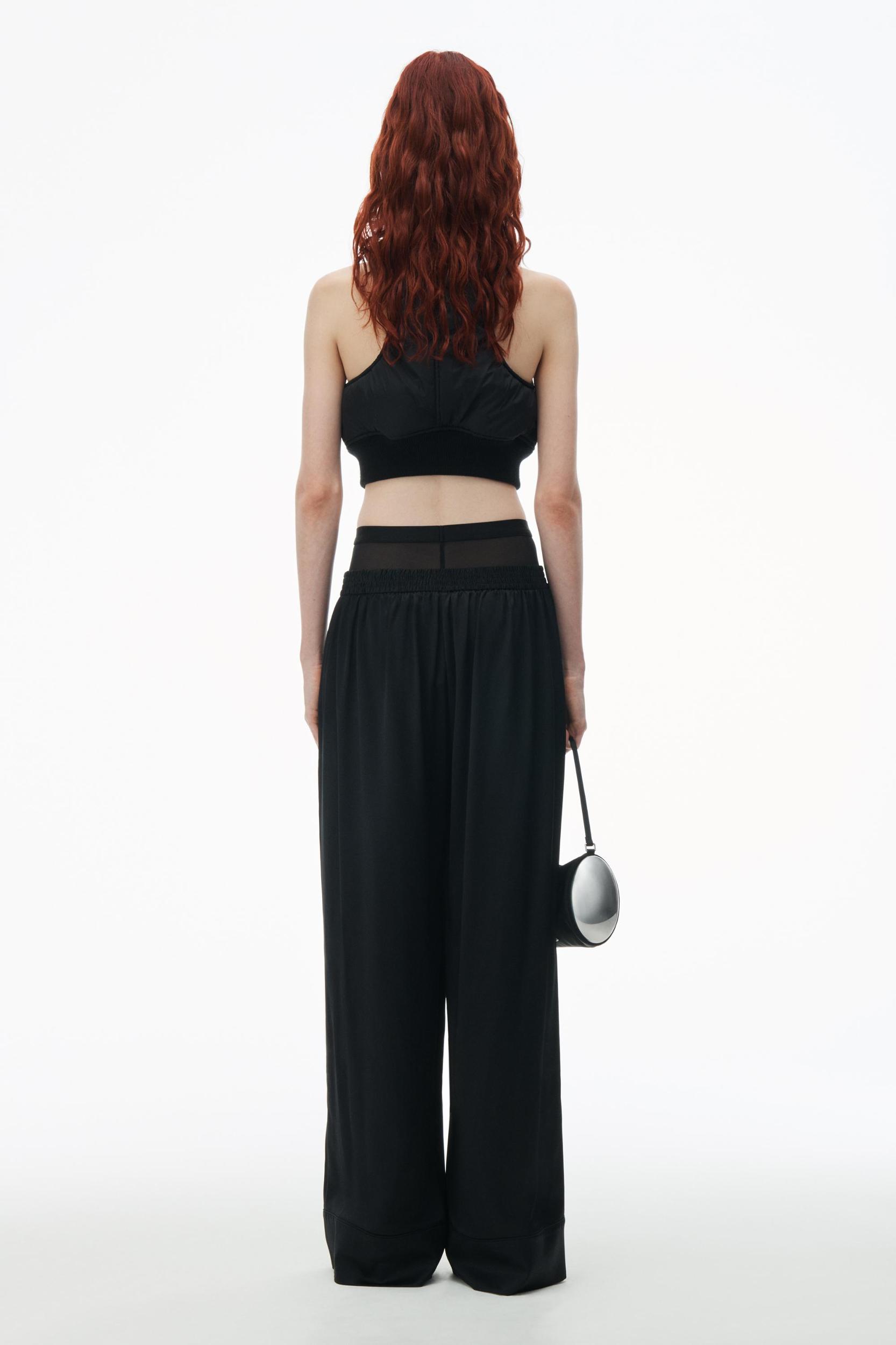 black silk charmeuse low rise boxer pant with logo elastic waistband and peek-a-boo high rise mesh underwear