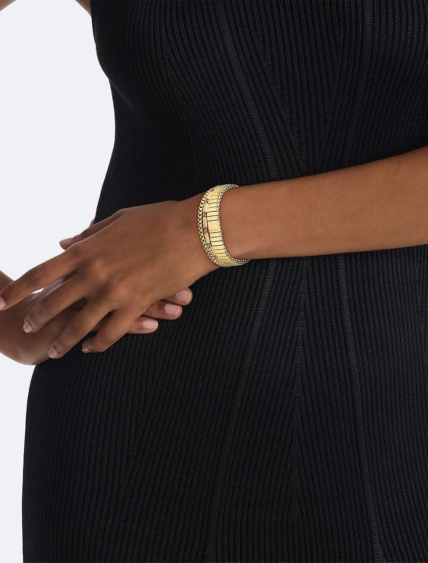 A bracelet set with three separate, sophisticated pieces that layer beautifully together. Each bracelet has a distinct texture and shape. The wide bracelet expands to adjust to an ideal fit while the beaded and link chain bracelet have a clasp closure.