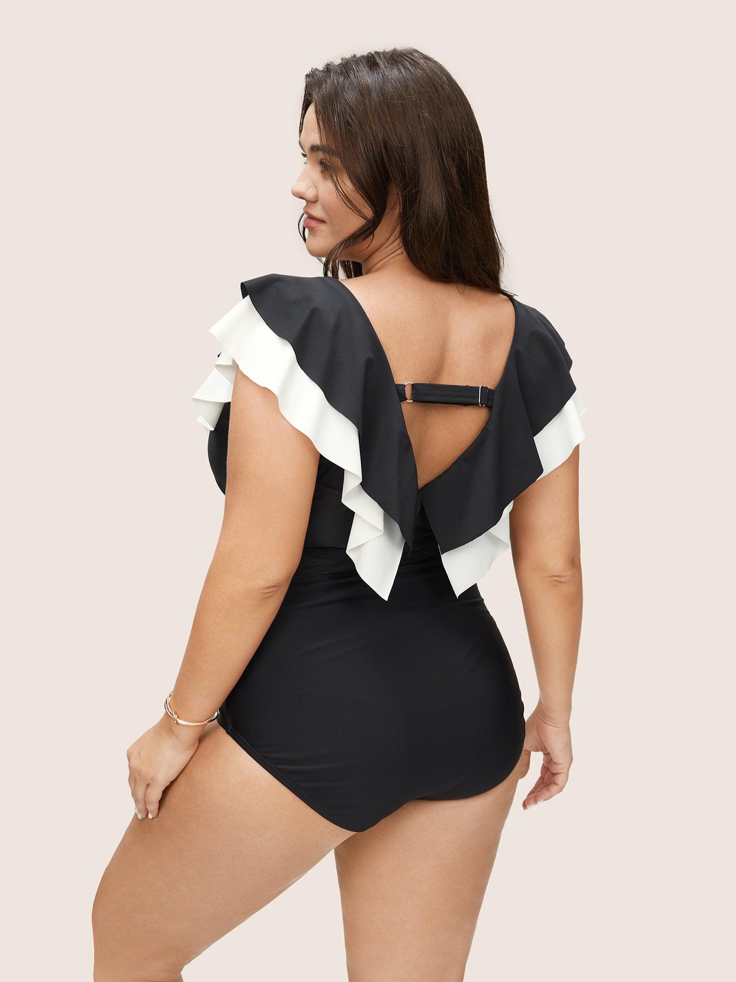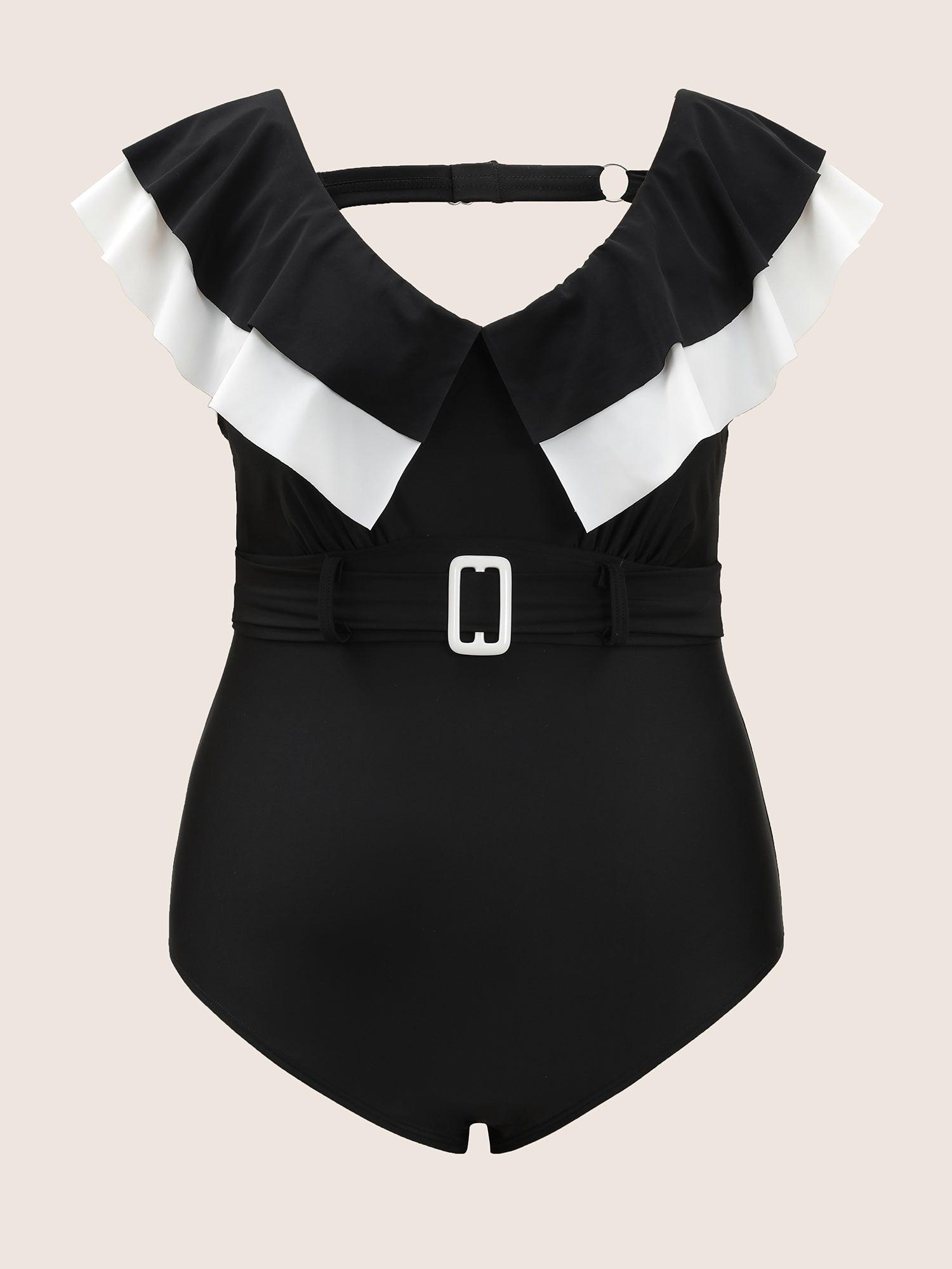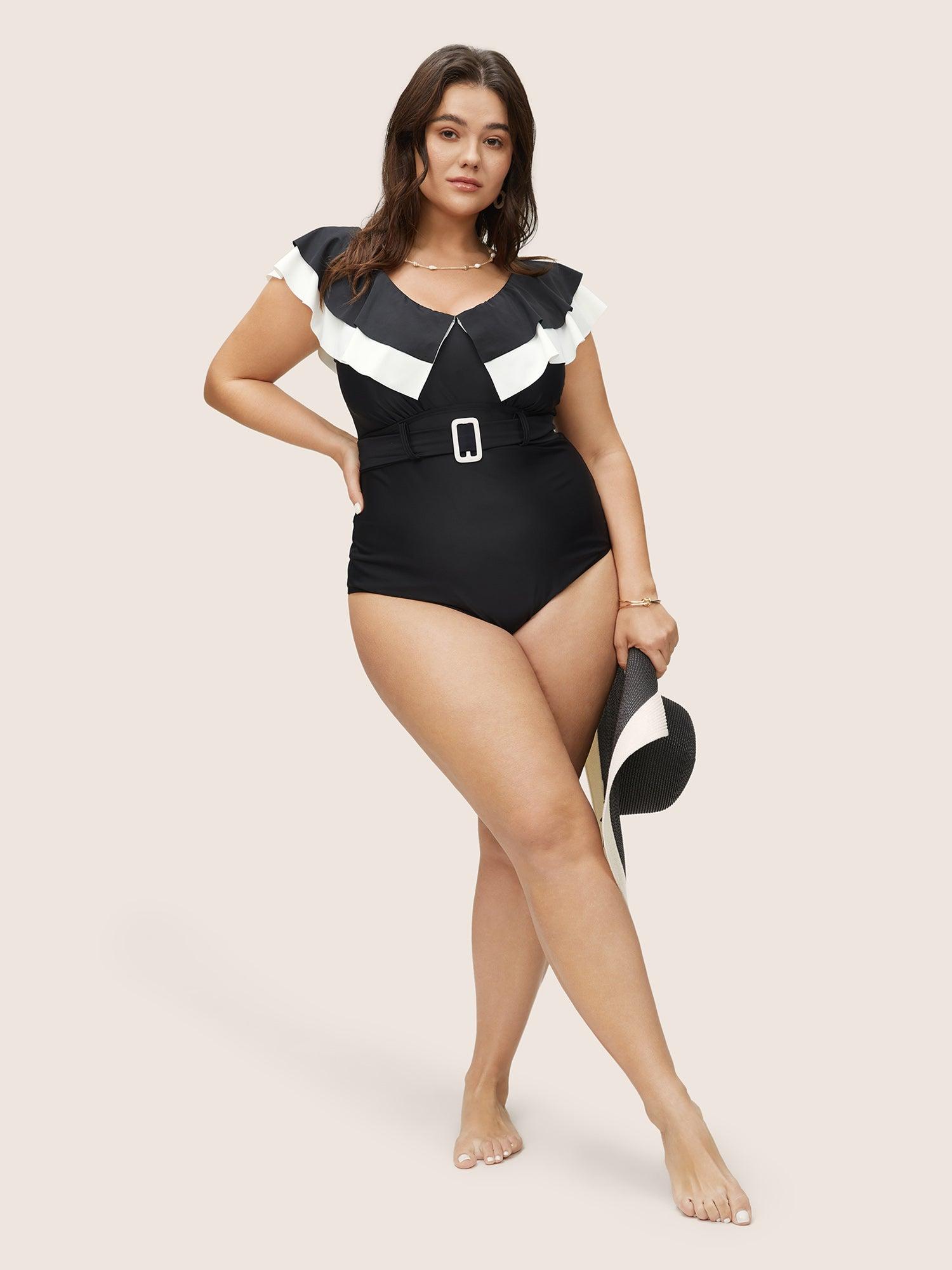 Shop Layered Ruffle Trim Belted One Piece Swimsuit now and redefine your style with confidence at BloomChic. Tailored for mid and plus-size women. This trendy Swimwear Women, sizes 10-30. Season:Winter;Color:Black;Bra Type:Wireless;Coverage:Full;Waist Design:High Rise;Neckline:V-neck;Sleeve Type:Sleeveless;Pattern Type:Patchwork;Details:Ruffles;Pocket:No-pocket;Belt:Belt;Chest pad:Removable Padding;Lining:Lining