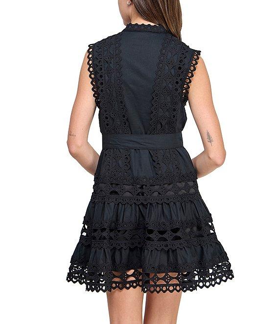 From Layered With Love, this dress features: Cotton voile fabrication Mock neckline Sleeveless Fit and flare silhouette Lined Belt Lace trim details Button front closure Approx. 34" in length from high point shoulder Cotton hand wash Imported.
