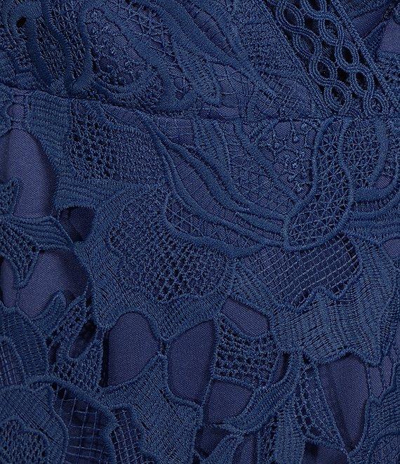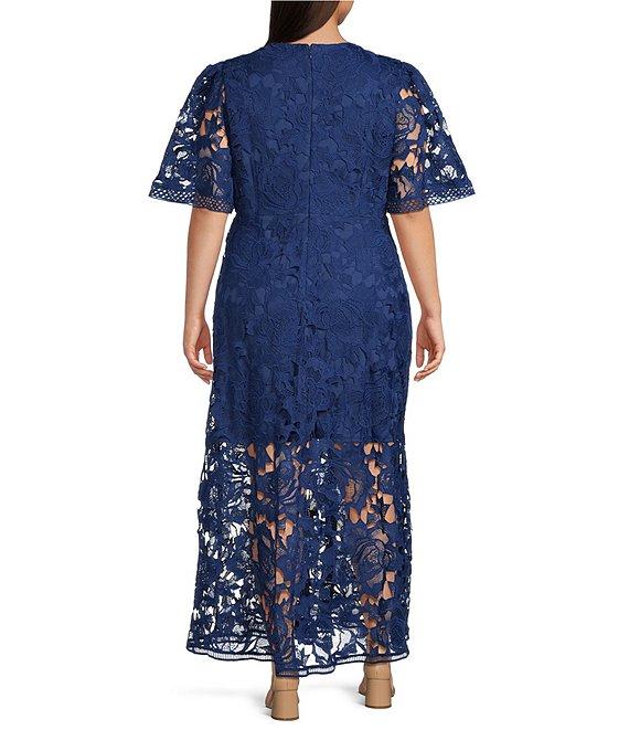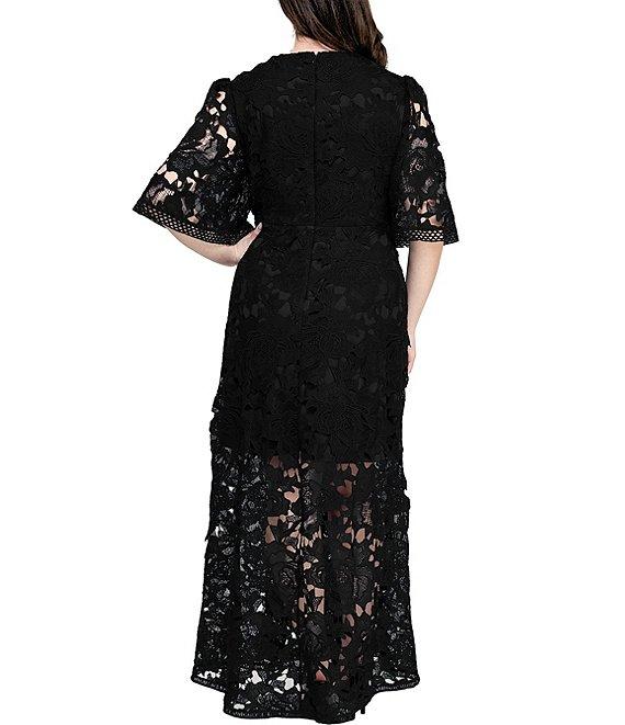 From Layered With Love Plus, this dress features: Lace fabrication V-neckline with trim detailing Short sleeves Lined Illusion hem Zip back closure Approx. 54.5" in length from high point shoulder Polyester Dry clean Imported.