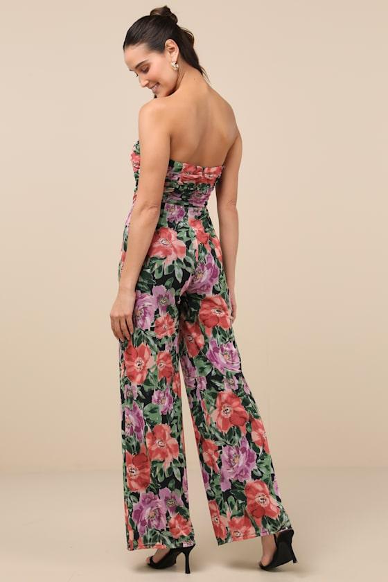 The Lulus Layka Black Multi Floral Mesh Wide-Leg Jumpsuit is ready for spring days spent with your besties and glasses of bubbly! A vibrant floral print dances across stretchy mesh as it shapes this flirty jumpsuit that features a strapless, ruched bodice and a straight neckline. The high, fitted waist sits atop breezy wide pant legs that finish at full-length hems. Hidden no-slips strips and zipper/clasp at back.