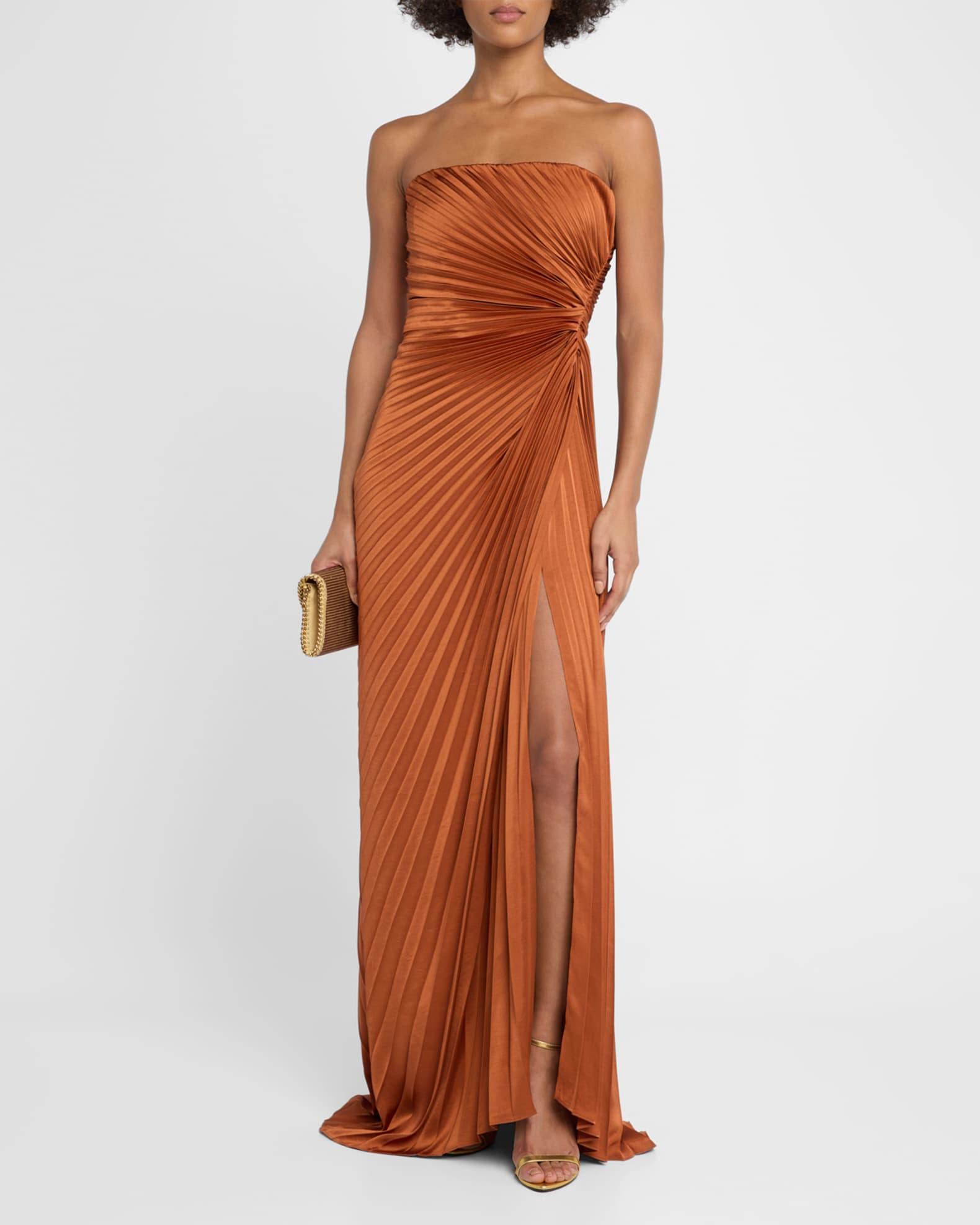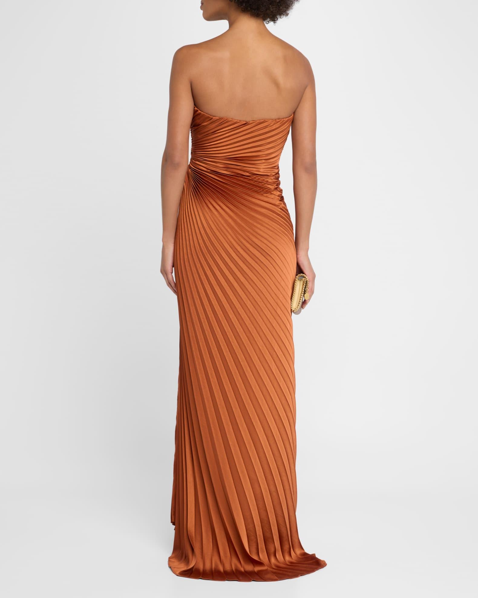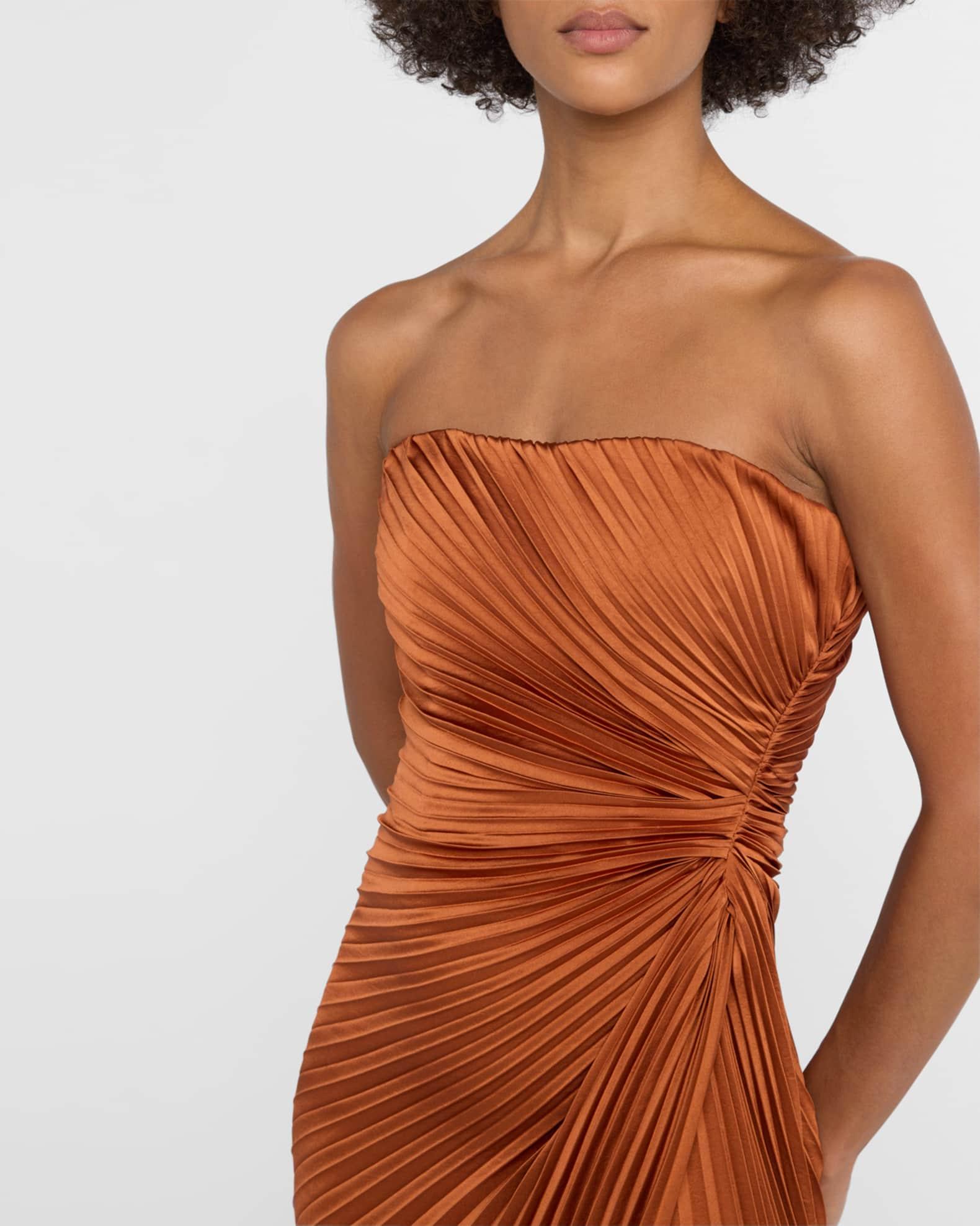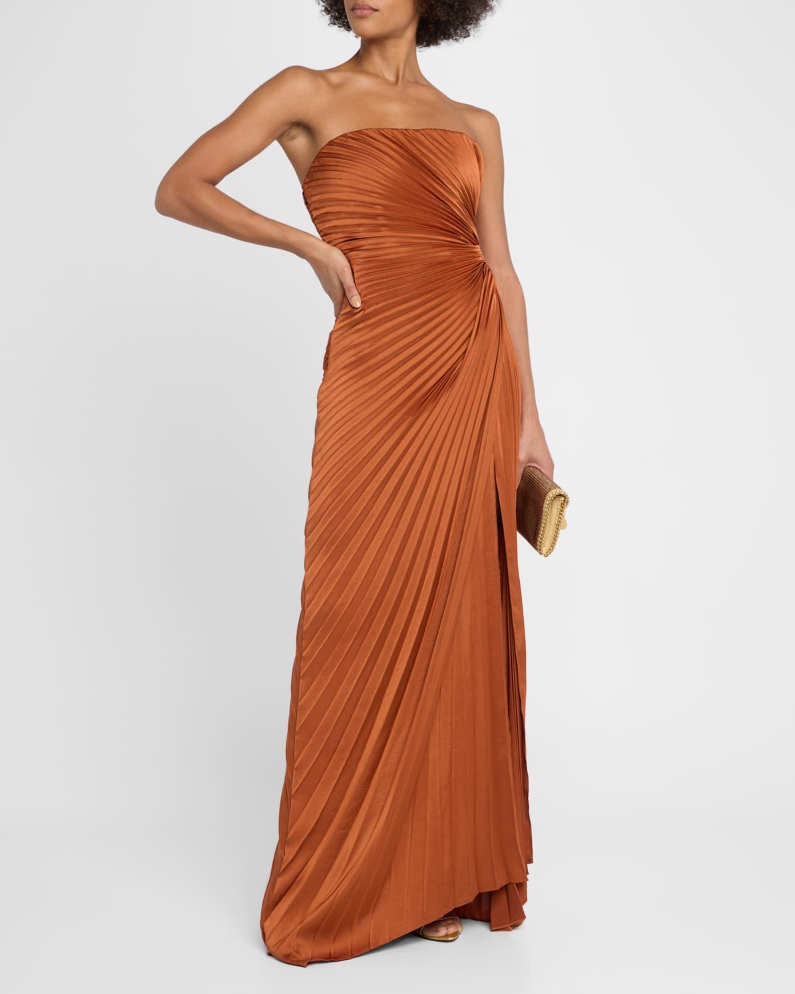 A.L.C. "Layla" satin gown with intricate pleating throughout Strapless neckline Sleeveless Gathered waist Column silhouette Thigh-high slit Side zip Polyester Lining: Elastane/polyester Dry clean Imported Size Note: Item runs small, consider ordering a size up.