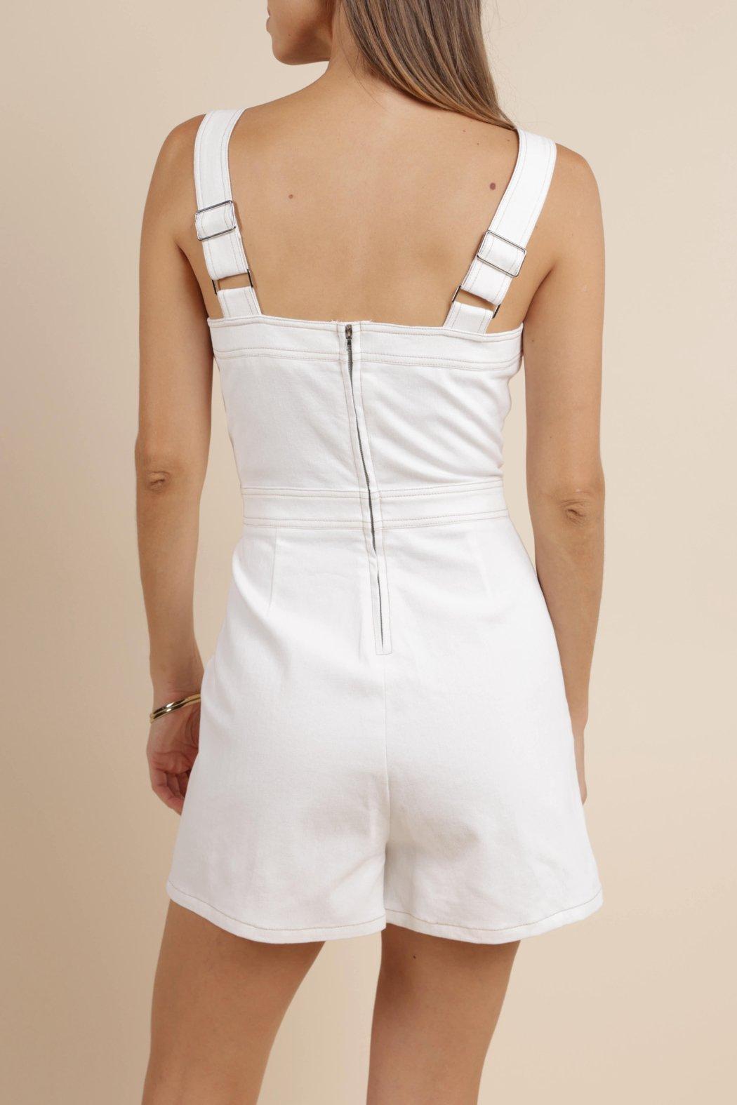 The square neckline and wide shoulder straps add a modern, tailored appeal, while the front button-down detail and princess seaming elongate the silhouette. A fitted bodice transitions into flattering high-waisted shorts with flap pockets that bring both style and function.