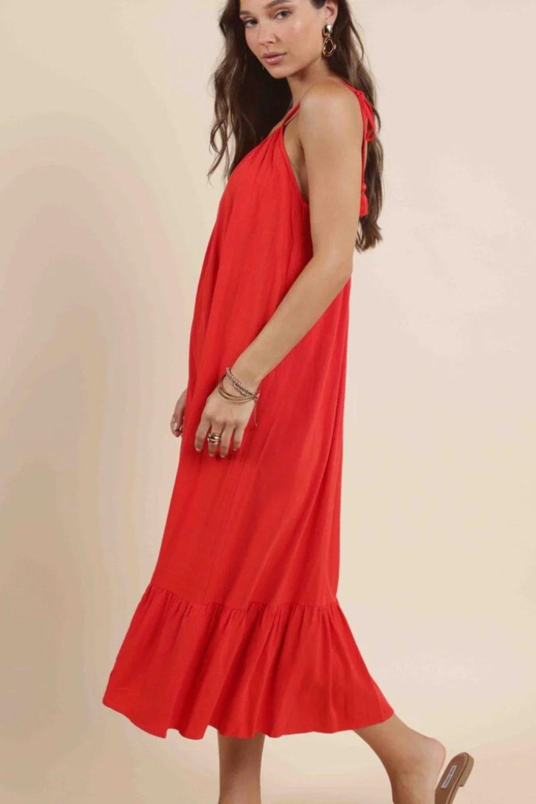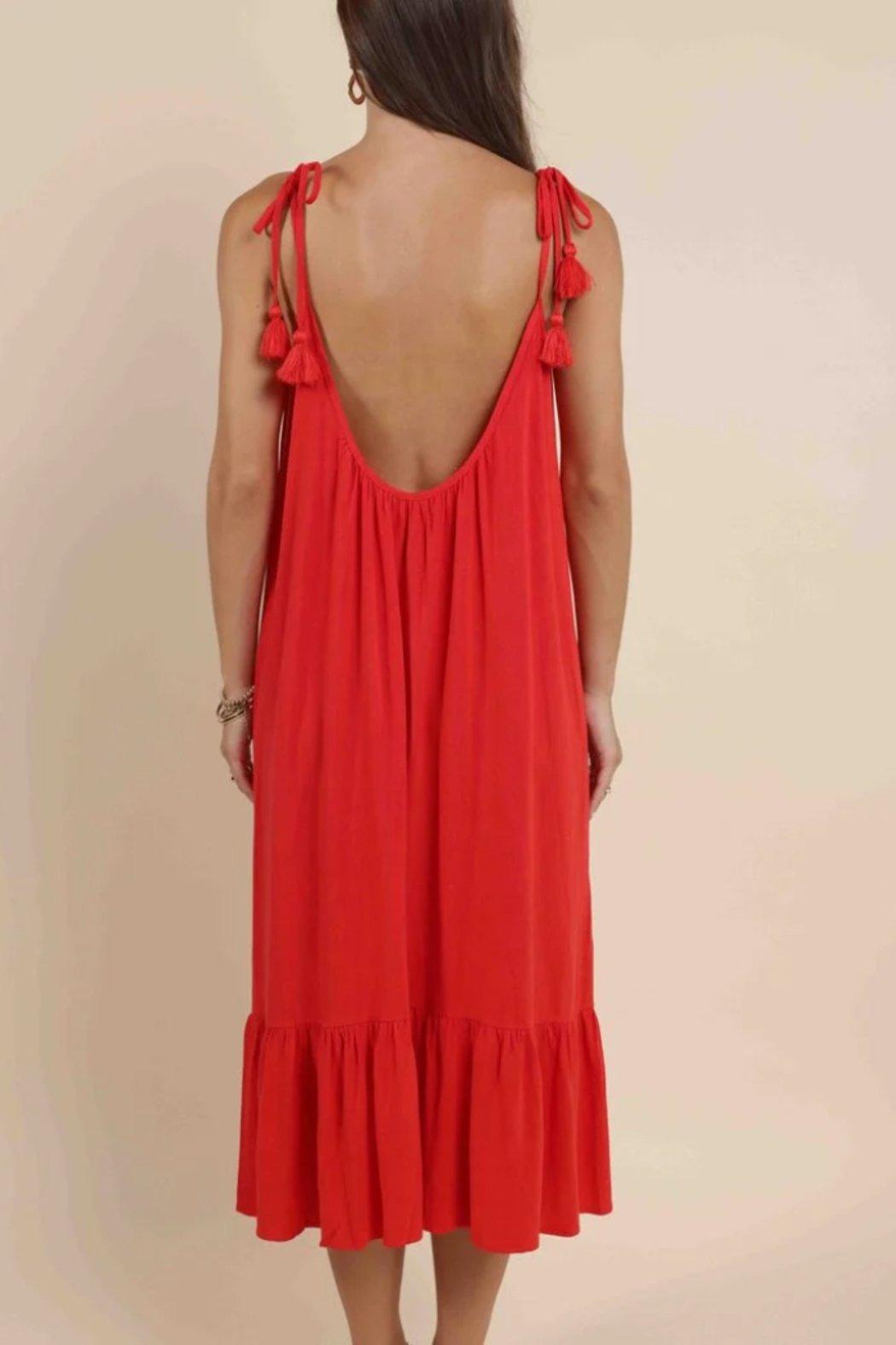 The Layla Tie Strap Maxi Dress is a breezy, sun-kissed statement made for warm-weather escapes. Designed with adjustable tie straps accented by playful tassel details, this dress flatters with ease while adding a touch of whimsy to your look. The flowing maxi silhouette moves beautifully with every step—perfect for beachside strolls, garden parties, or golden hour getaways.