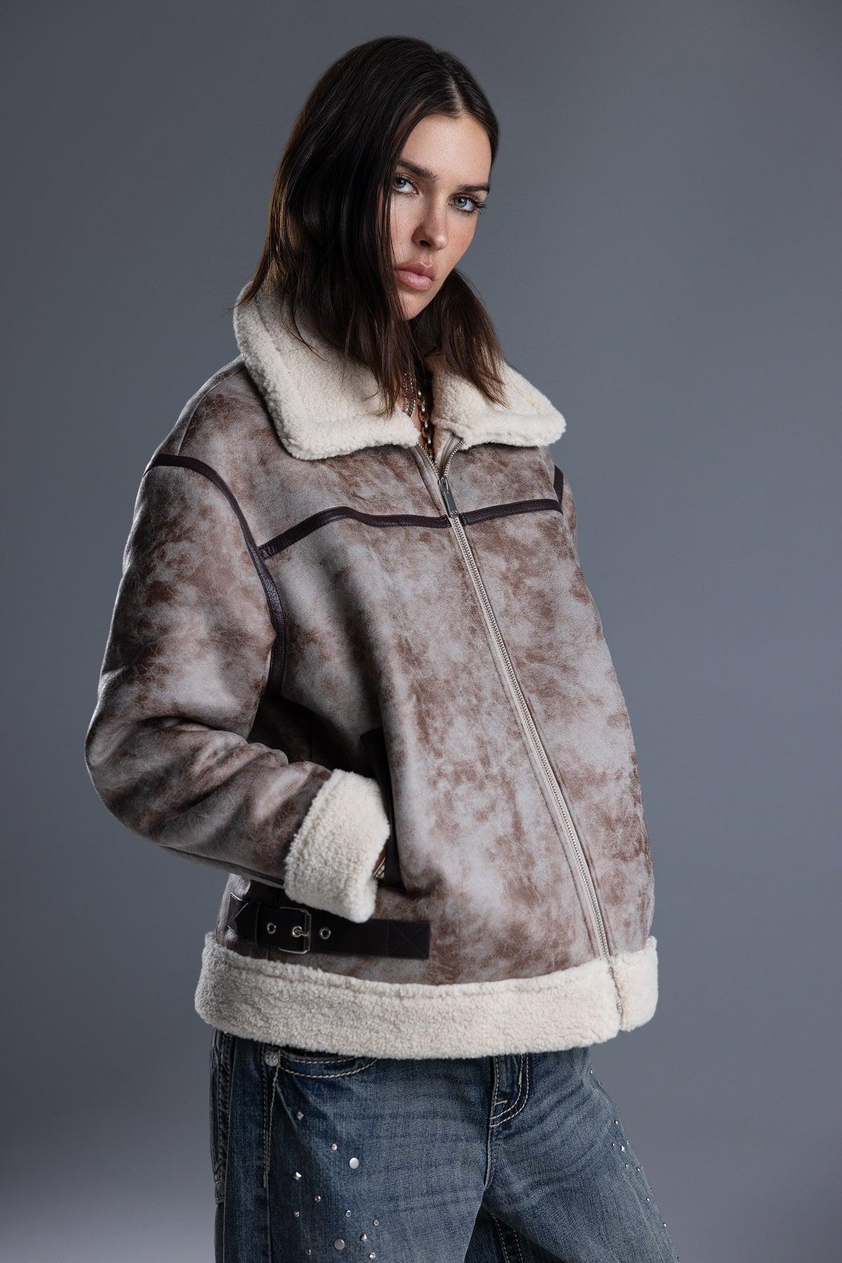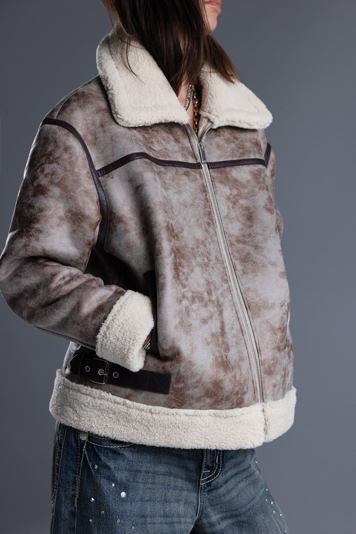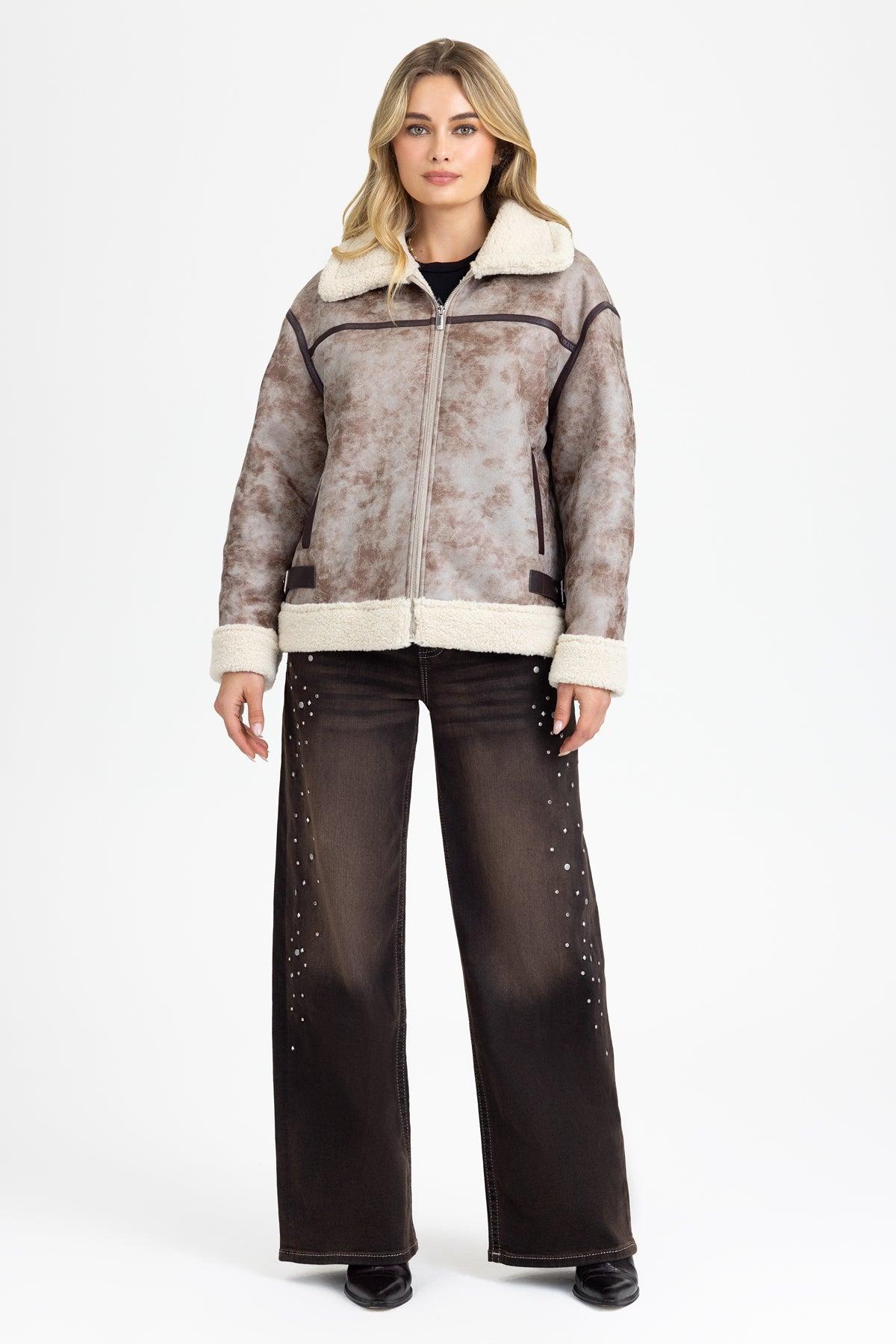 Oversized faux suede jacket- Acid-washed finish- Contrast paneled construction with faux-leather trim- Adjustable side belt tabs- Sherpa-accented collar, cuffs, and hem- Zip-front closure- Mock neckline Model is wearing size: 25Model Measurements:Height: 5’8”Bust: 32BWaist: 25”Hips: 35”Fabric Content: Self/Faux: 100% Polyester / Contrast/Faux: 45% PU, 55% Cotton / Trim/Faux: 100% PUCare: Gentle machine wash inside-out with like colors in cold water. Tumble dry low.Style No. BMJ0805L-BROWN