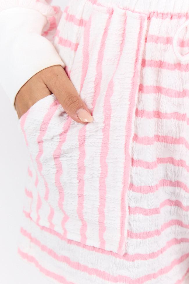 Details Striped Pink and White Lounge Shorts Fabric has stretch Elastic drawstring waistband, functional pockets Unlined Size small inseam: 2" Material and Care Shell: 97% polyester 3% elastane, Solid fabric: 51% cotton 49% polyester Machine wash cold, line dry Patterns may vary Materials may have natural variations Colors may vary from different viewing devices.