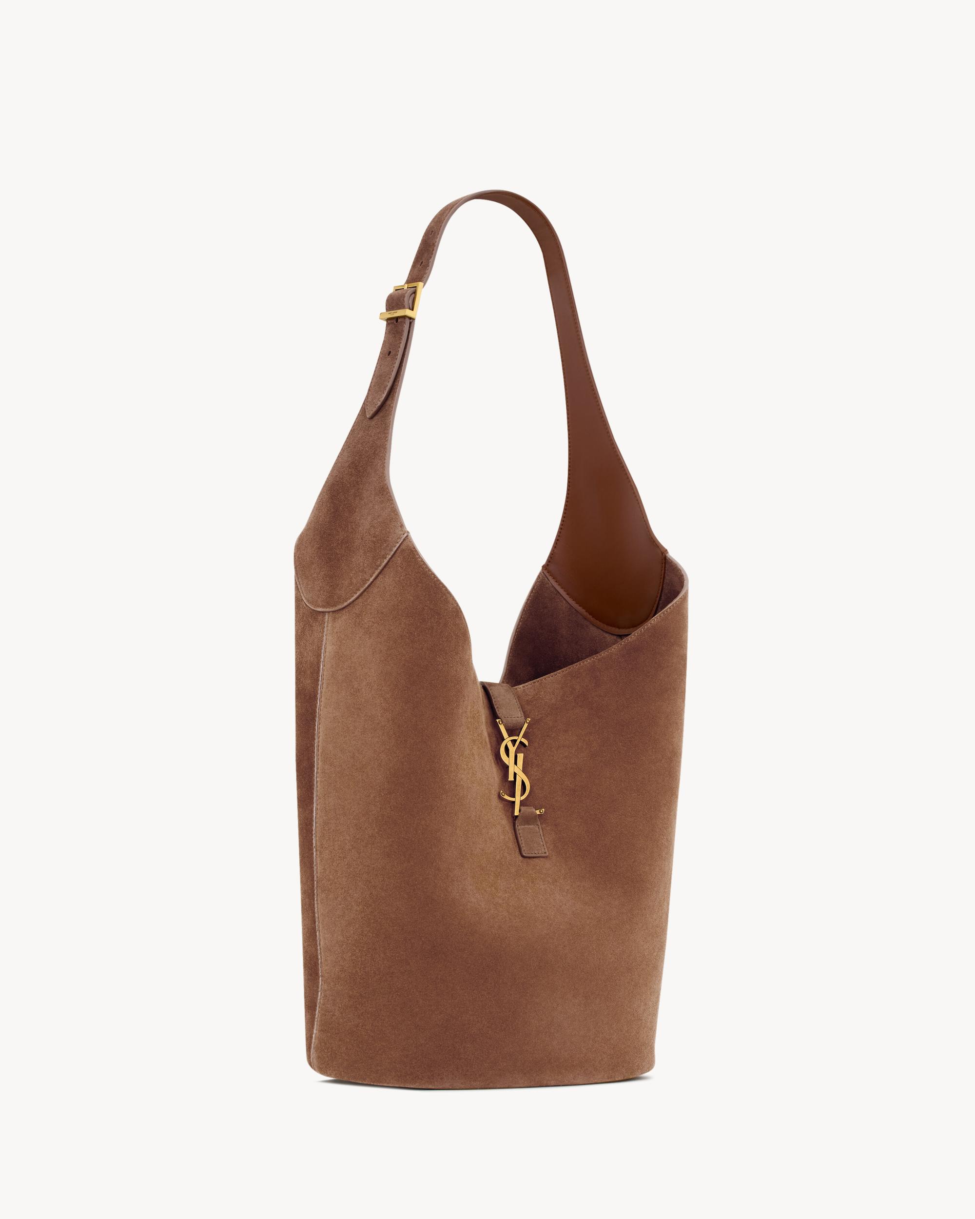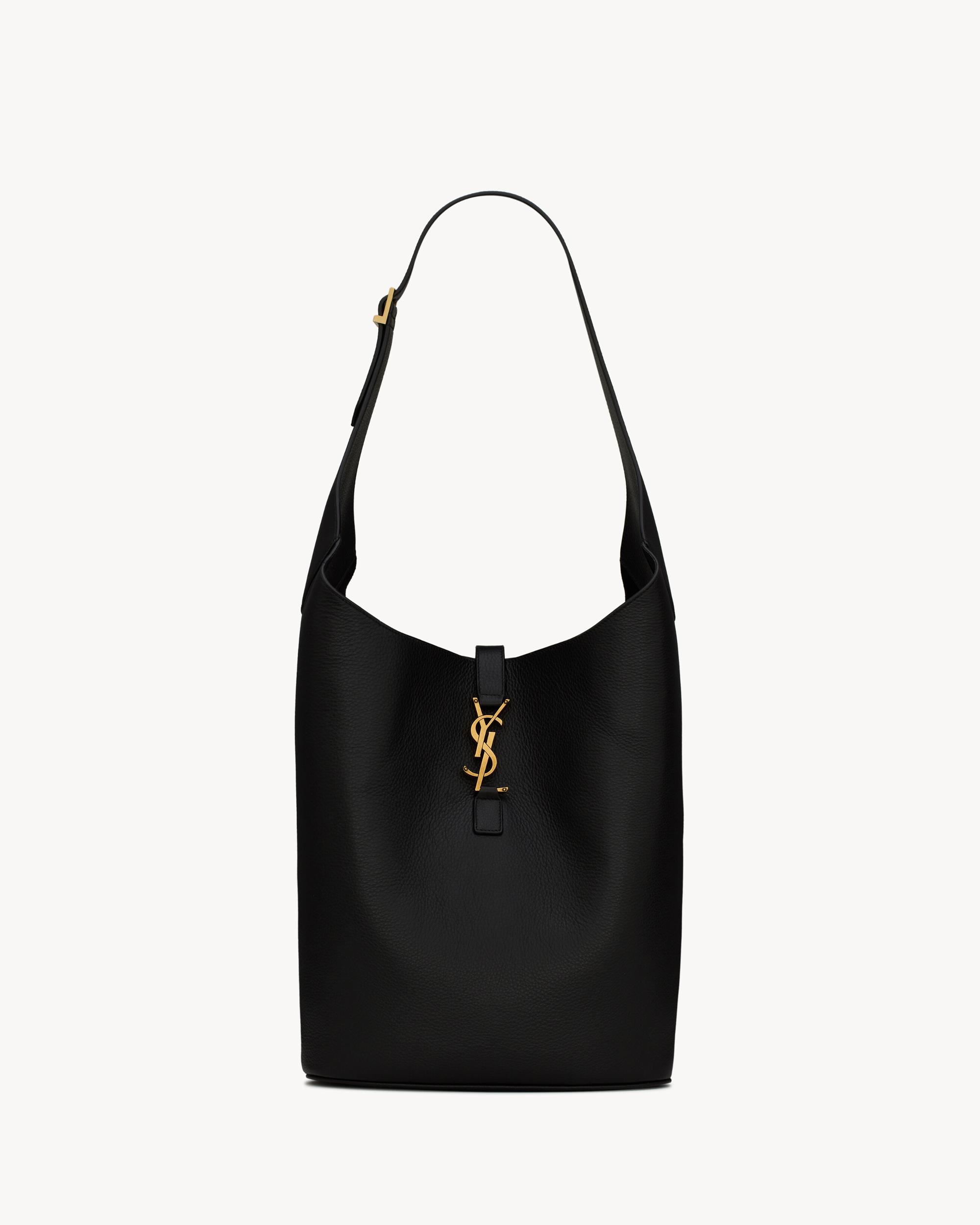 The hobo bucket version of the iconic LE 5 À 7 in finely grained leather, defined by its leather tab closure decorated with the CASSANDRE. Spacious and lined in tonal suede, it features one main compartment with an inner zip pocket. An adjustable strap allows for bespoke carry options.